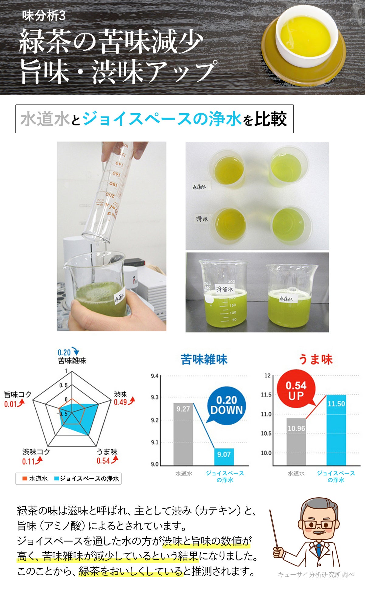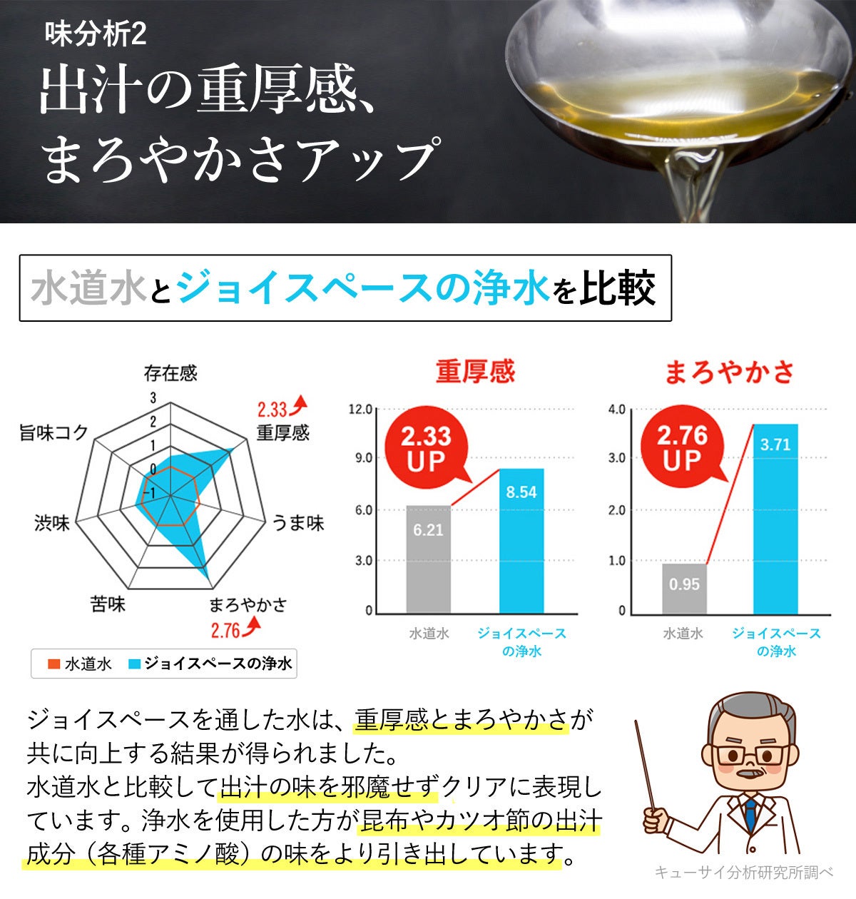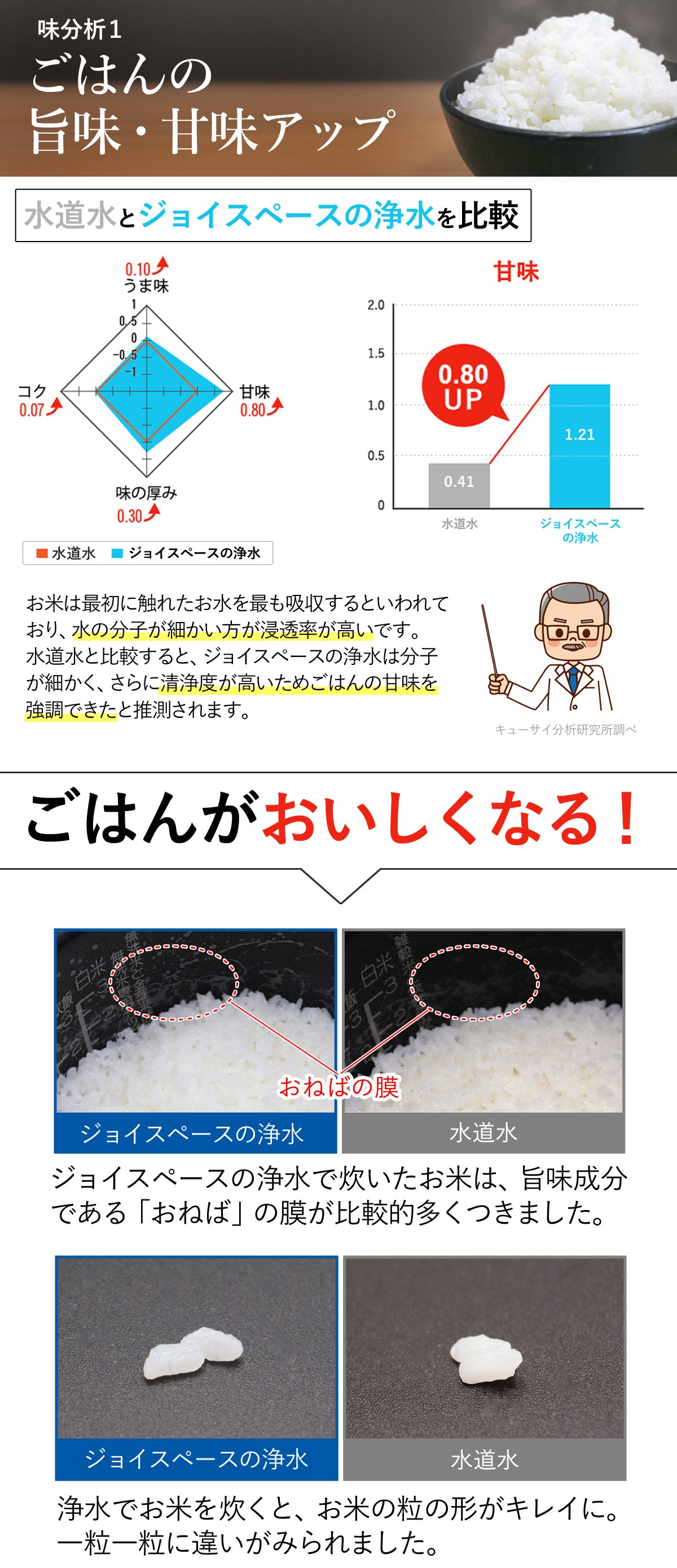 2021/09/02 17:36お世話になっております。株式会社アクアリードです!こちら、長寿命浄水器ジョイスペース1wayの掲載期間が残すところ4日となりました。現在39名のご支援者から熱いサポートを頂いております。皆様、本当にありがとうございます!ジョイスペースの浄水の最大の魅力は長寿命カートリッジにありますが、その”質”も自慢の一つです。第三者機関で検査した結果、ふつうの水道水よりも「甘味」「旨み」「コク」「味の厚み」すべての項目でおいしさアップの数値を図ることができました。そのまま飲んでもおいしい、浄水のまろやかなお味をぜひ毎日のお料理でもご体感いただけますと嬉しいです。残り4日、どうぞよろしくお願いいたします! もっと見る
