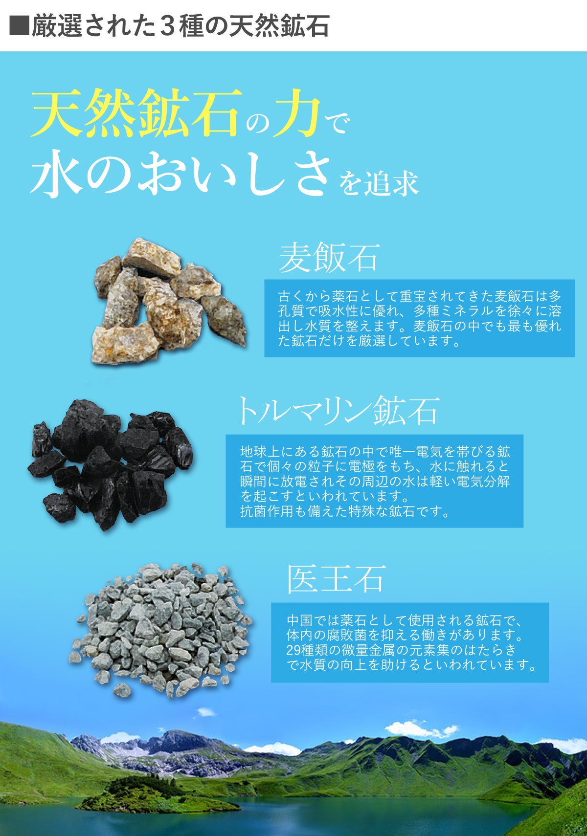 こうした鉱石の効果を取り入れることで、塩素除去だけでなく「水のおいしさ」にも注力し、浄水器の性能を磨きました。
