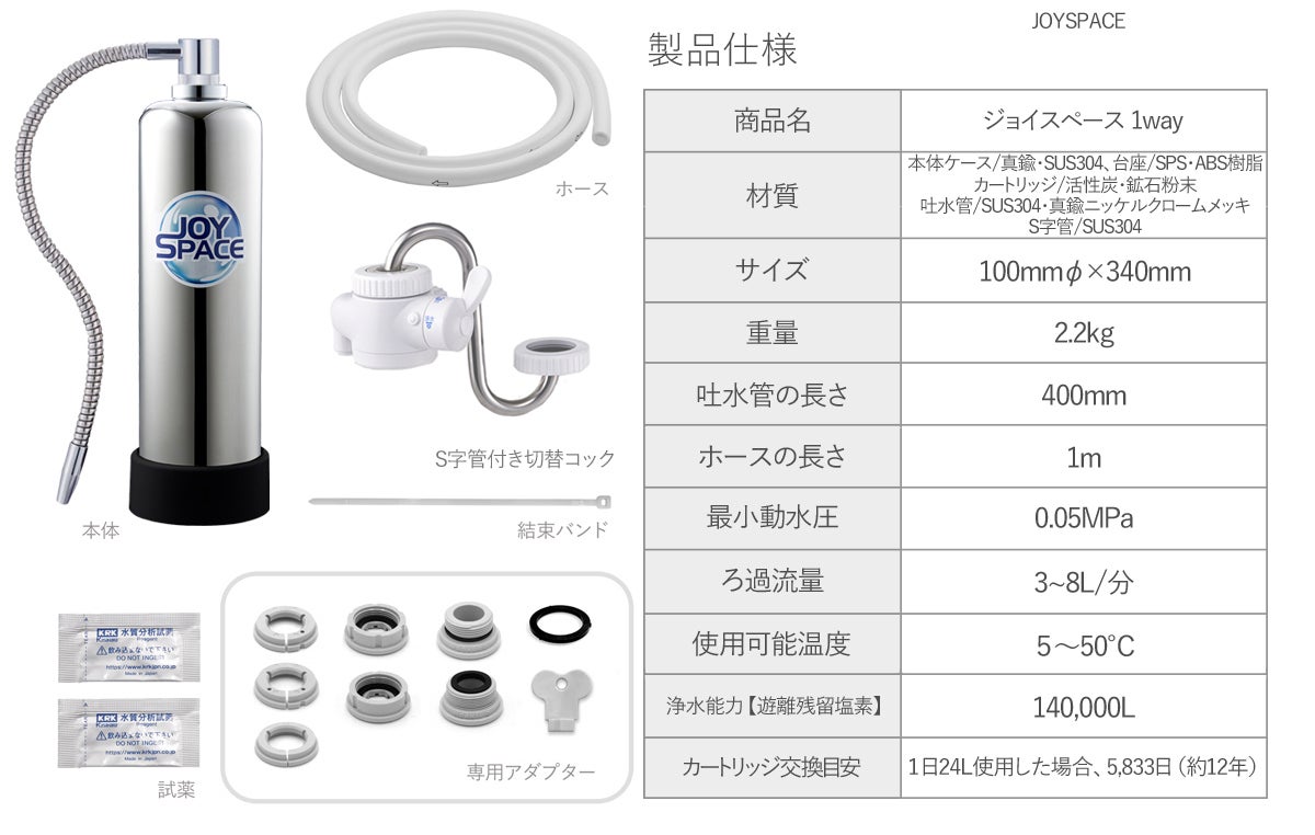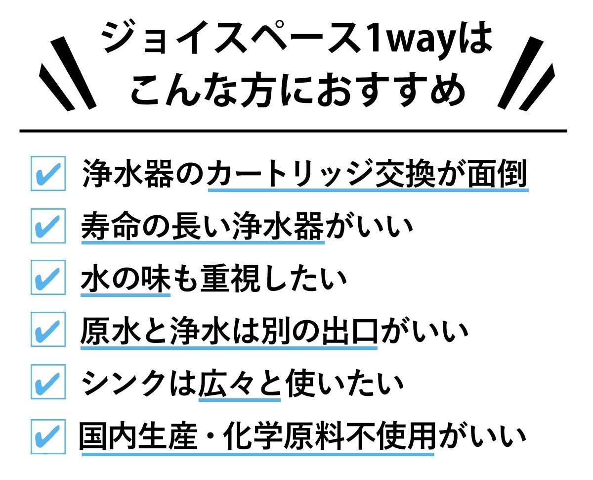 今回、ご紹介させていただきました「ジョイスペース1way」は、当社の自慢の長寿命浄水器ジョイスペースに『1way吐水管』を新たに搭載した、お水の味と新鮮さにもこだわる方へのアプローチを込めた最新の据置型浄水器です。