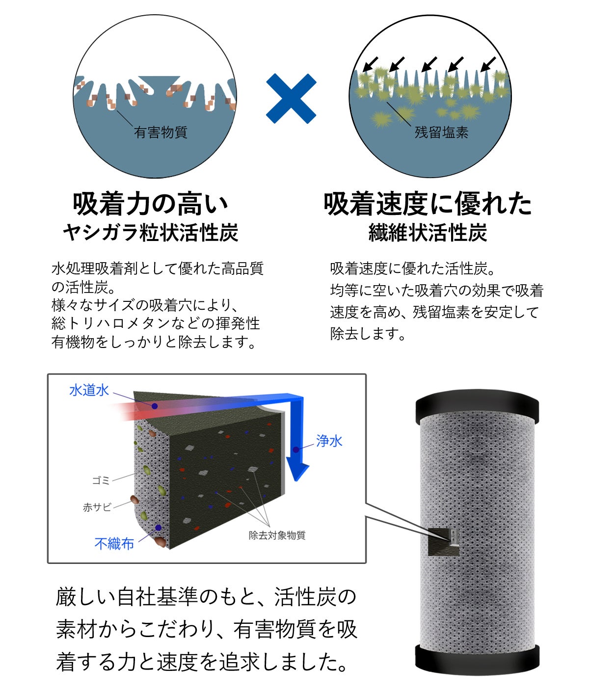 吸着力に優れた「ヤシガラ粒状活性炭」と、能力持続性に優れた「繊維状活性炭」の両方を原料に使用しています。