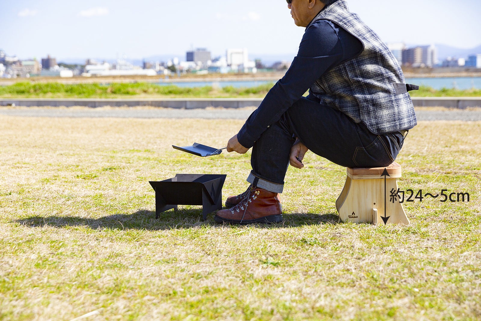地べたスタイルはワイルドでいいんですが、立ち上がろうとするたびに「よっこいしょ」。膝に手を当て一苦労(笑)。Takibisは、積極的に焚き火を楽しもうとするタキビストが、立ち上がりやすく作業がしやすい高さ(24〜5cm)につくられています。