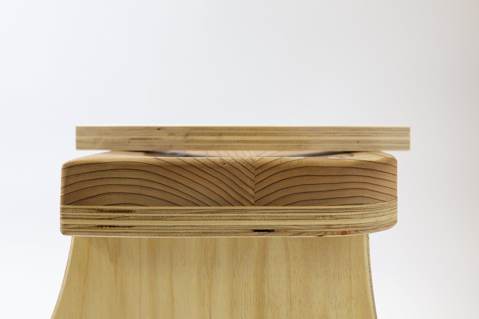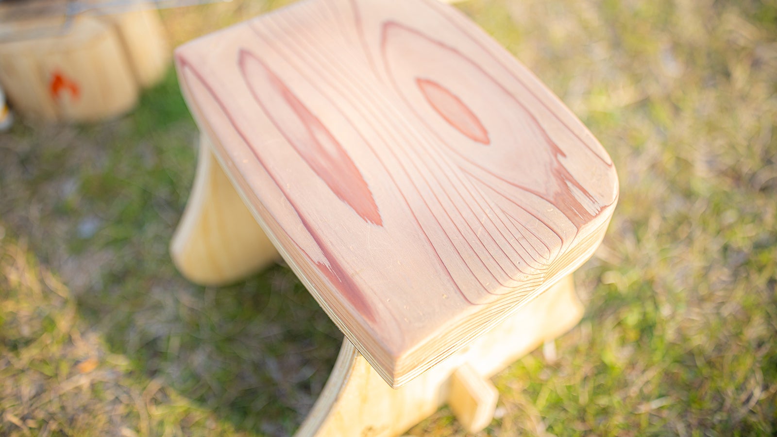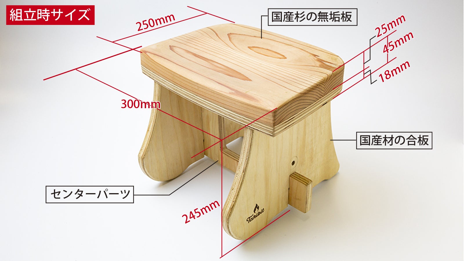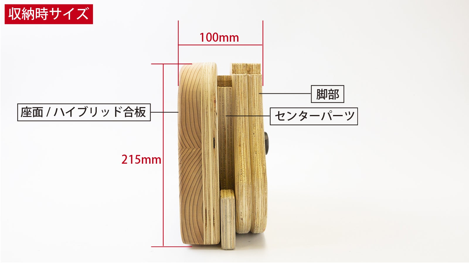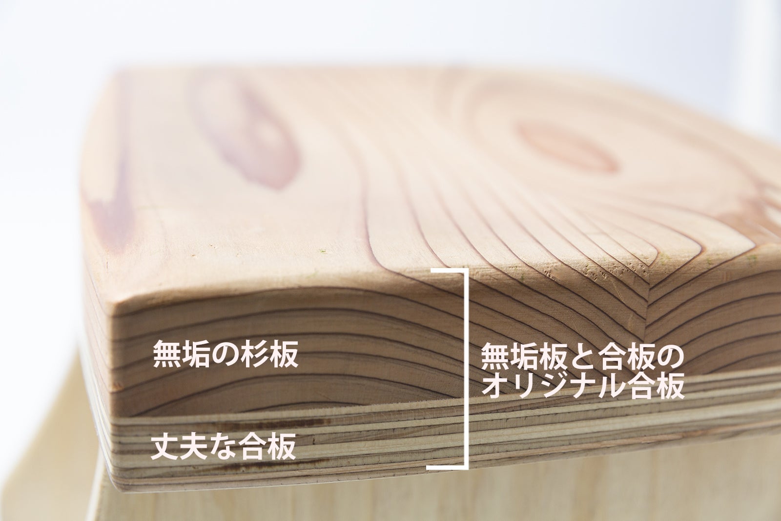 Takibisの座面部は肌当たりが優しい杉です。しかし脚部は耐水性が高くて硬い国産合板(JIS国産針葉樹F4/耐水1類)。その合板を、杉でできた柔らかい座面に差し込むと、どうしてもホゾ穴を舐めてしまいます。そこで新たに開発したのが、オリジナルの〝ハイブリッド合板〟です。