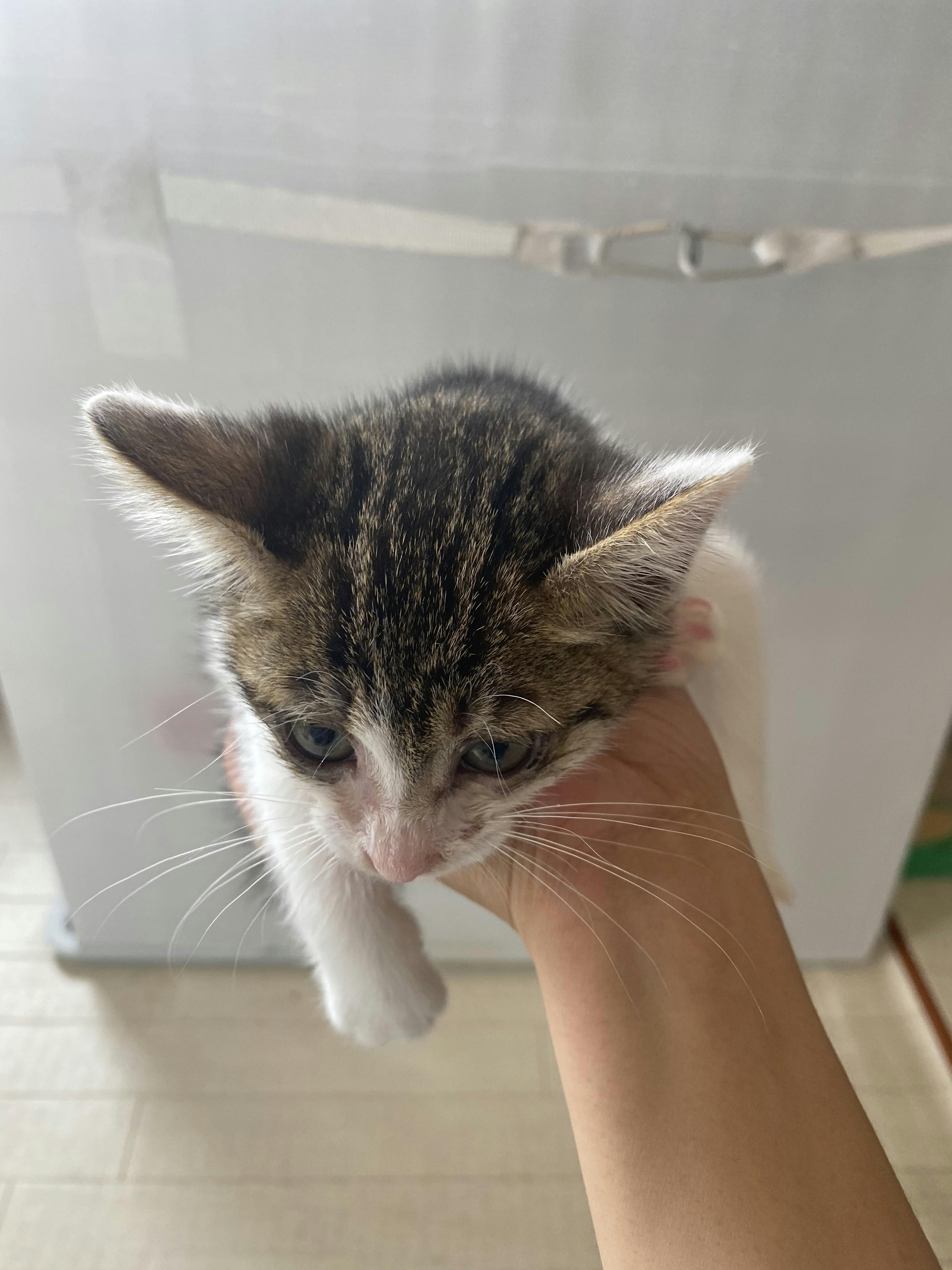 子猫は2ヶ月弱とのことで、体重は500gと軽めです。風邪気味なので目薬軟膏を処方してもらい、まずは体重を増やすため栄養をつけます!