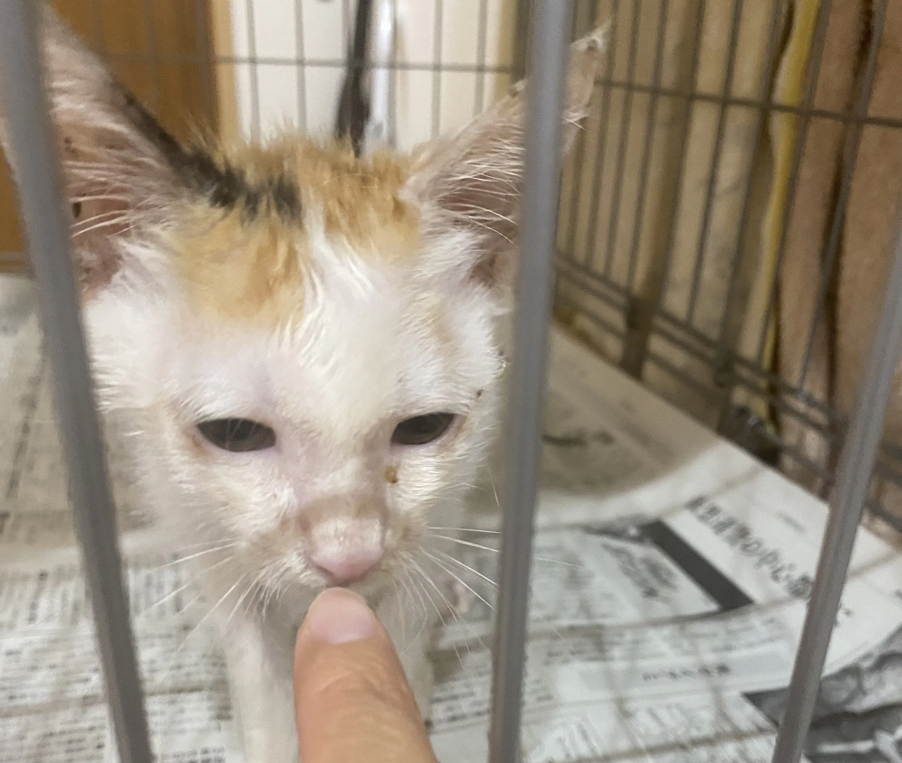 猫風邪かな、目やにがあり、ノミが付いてます。
