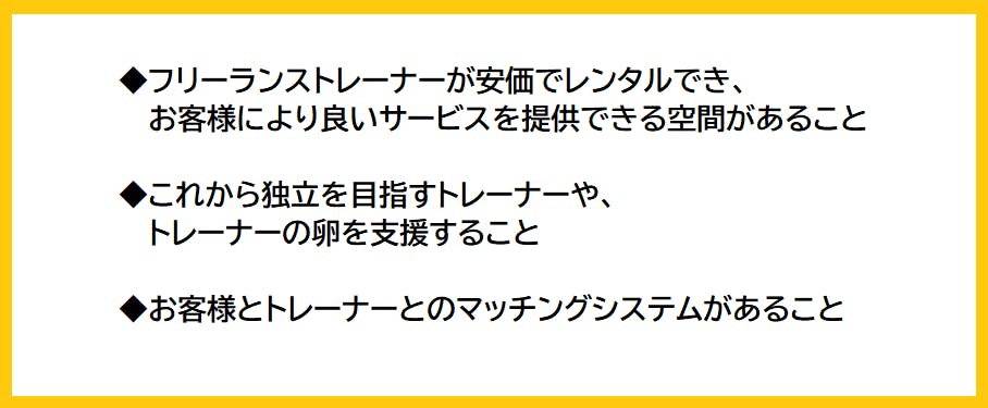 私たちの企画では、3つのポイントを押さえたレンタルジムを作ります。