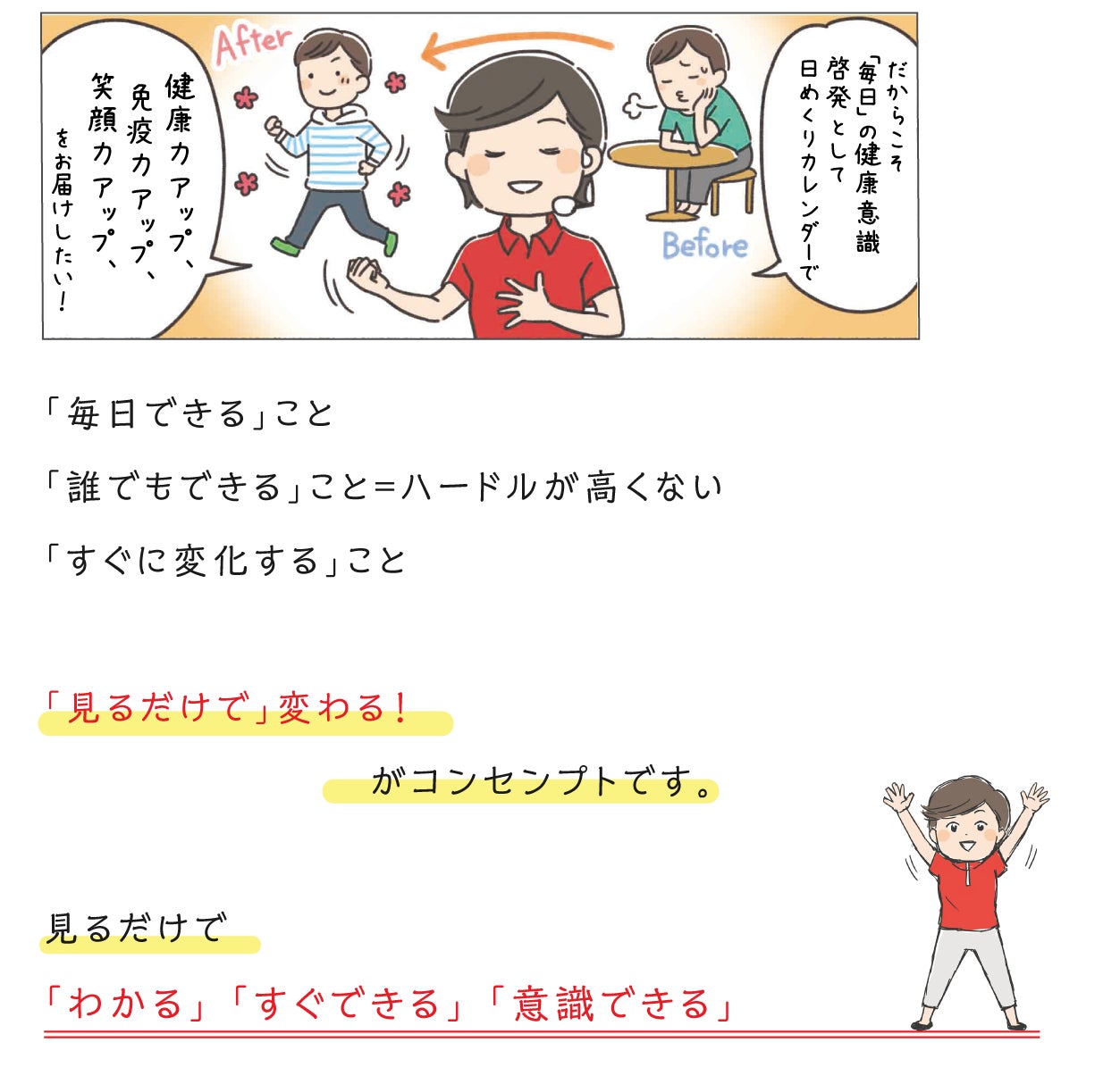 私は、数多くの企業様や団体様で心身の健康づくりの「きっかけ」になるよう「健康意識啓発」をテーマに講演会を中心とした活動を行ってきましたが、講演会後も継続したい、復習したいといったお声をいただくことが多くあり、書籍よりもより日常的に気付いて意識しやすい「日めくりカレンダー」で、自身が最も得意とする「意識啓発」を発信し続けられたら、と構想しました。