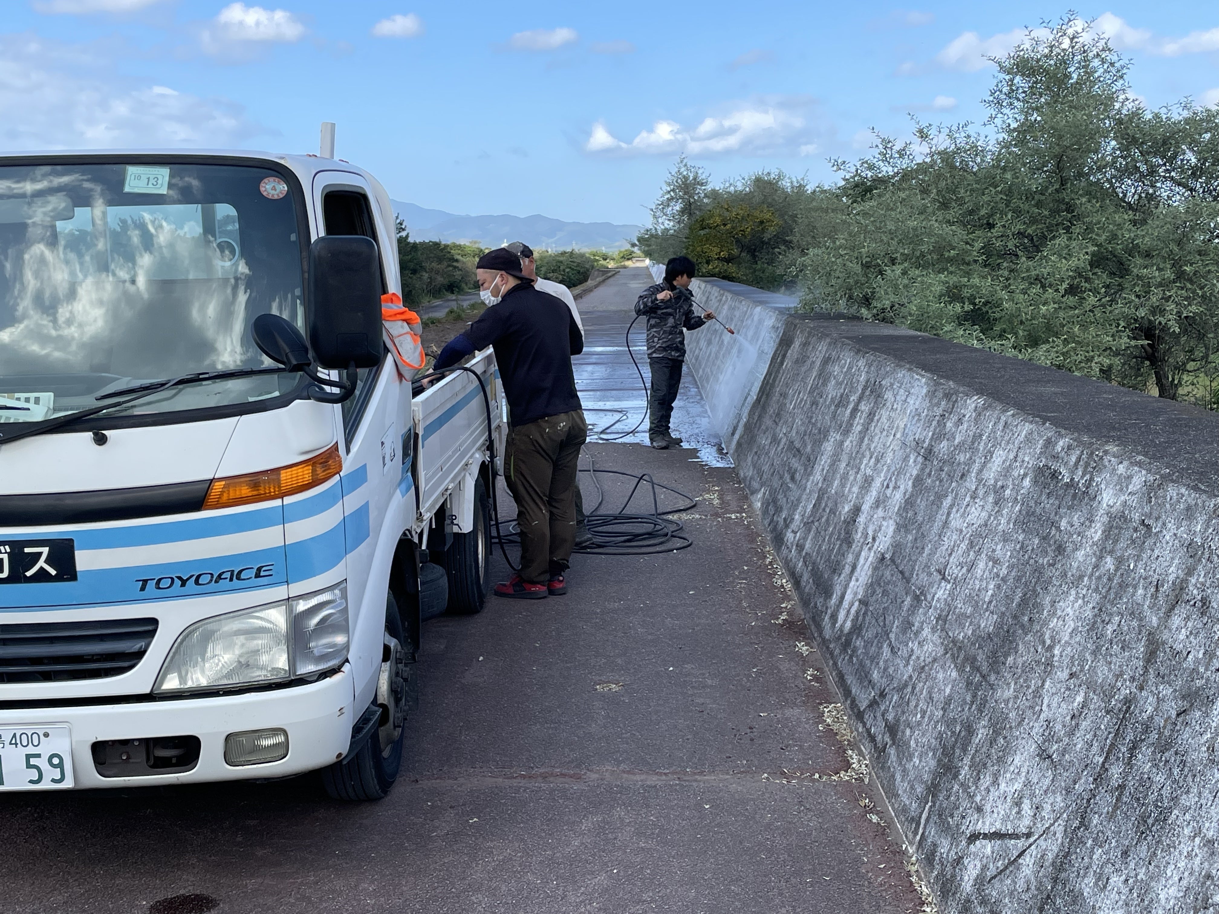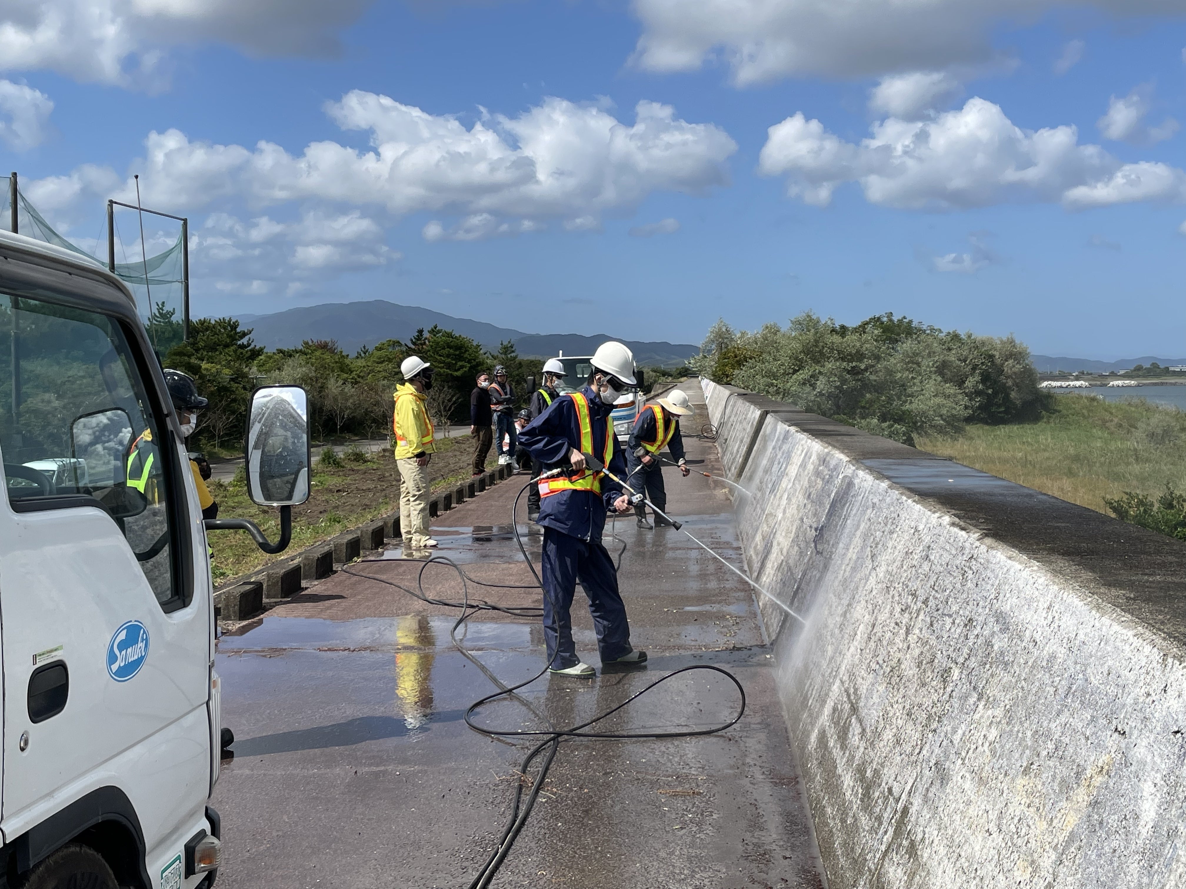 訓練生は職員に高圧洗浄機を用いての水洗いを丁寧に教えてもらいながら、実践していました。