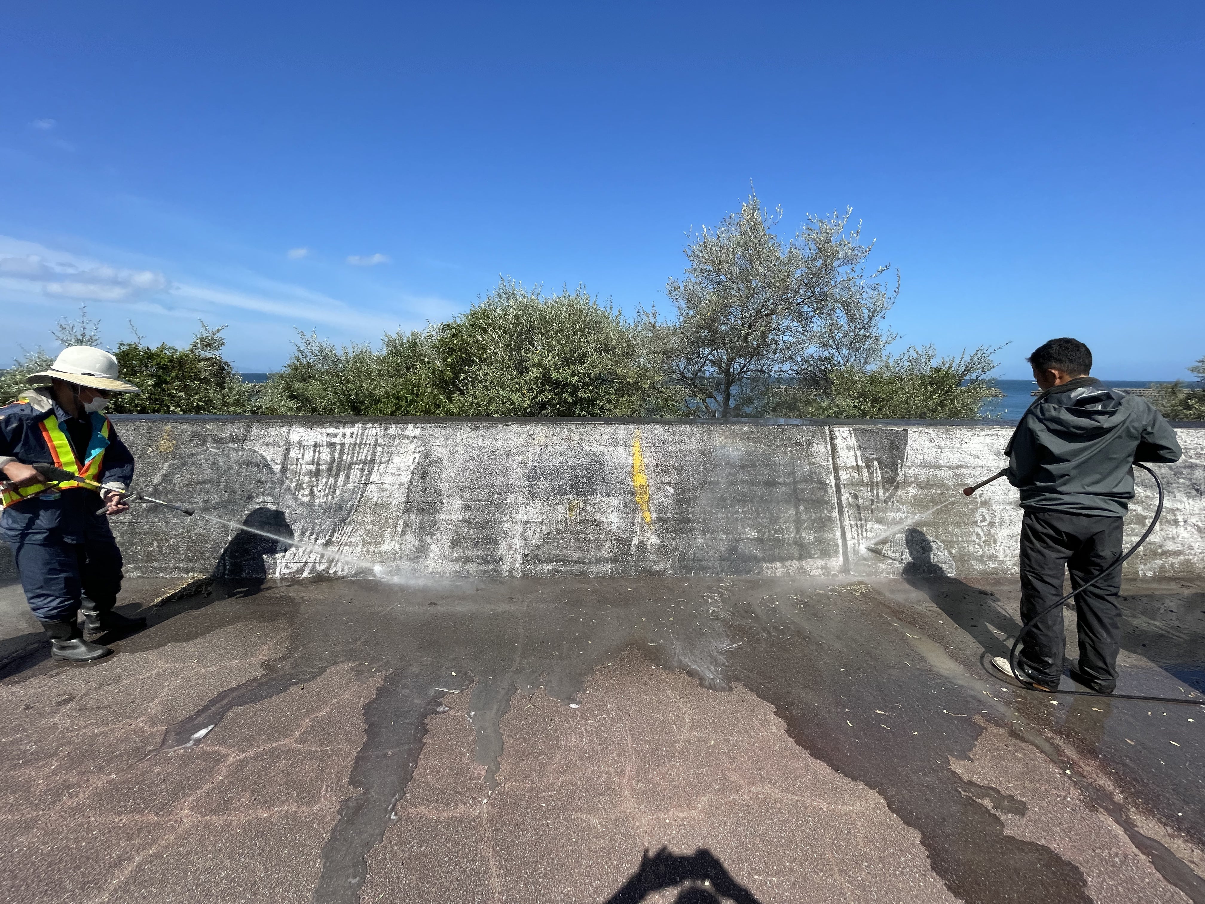 9時に始めた約200mの壁画の水洗いは13時ごろに終了し、明日以降シーラー塗り・白色塗りを行います。