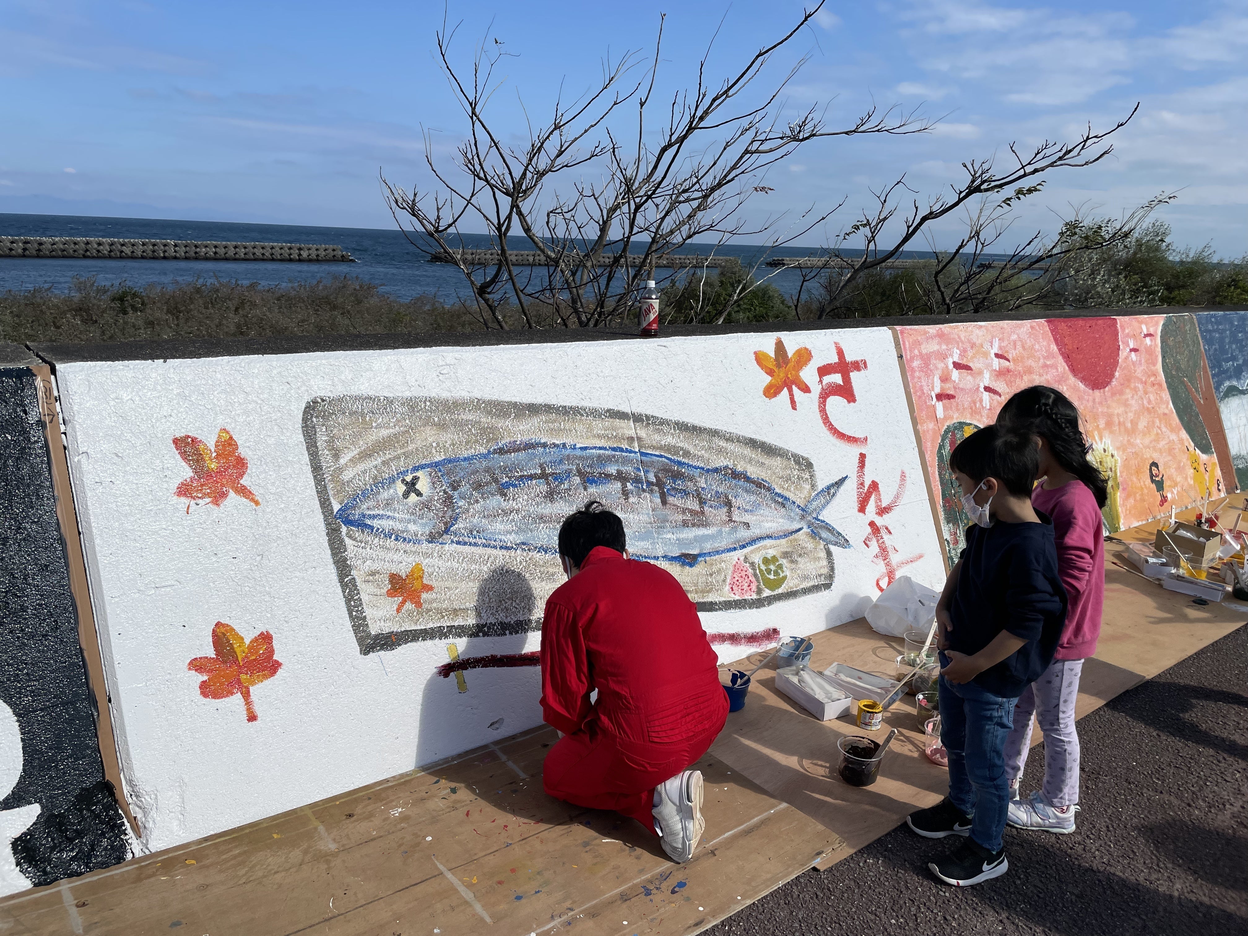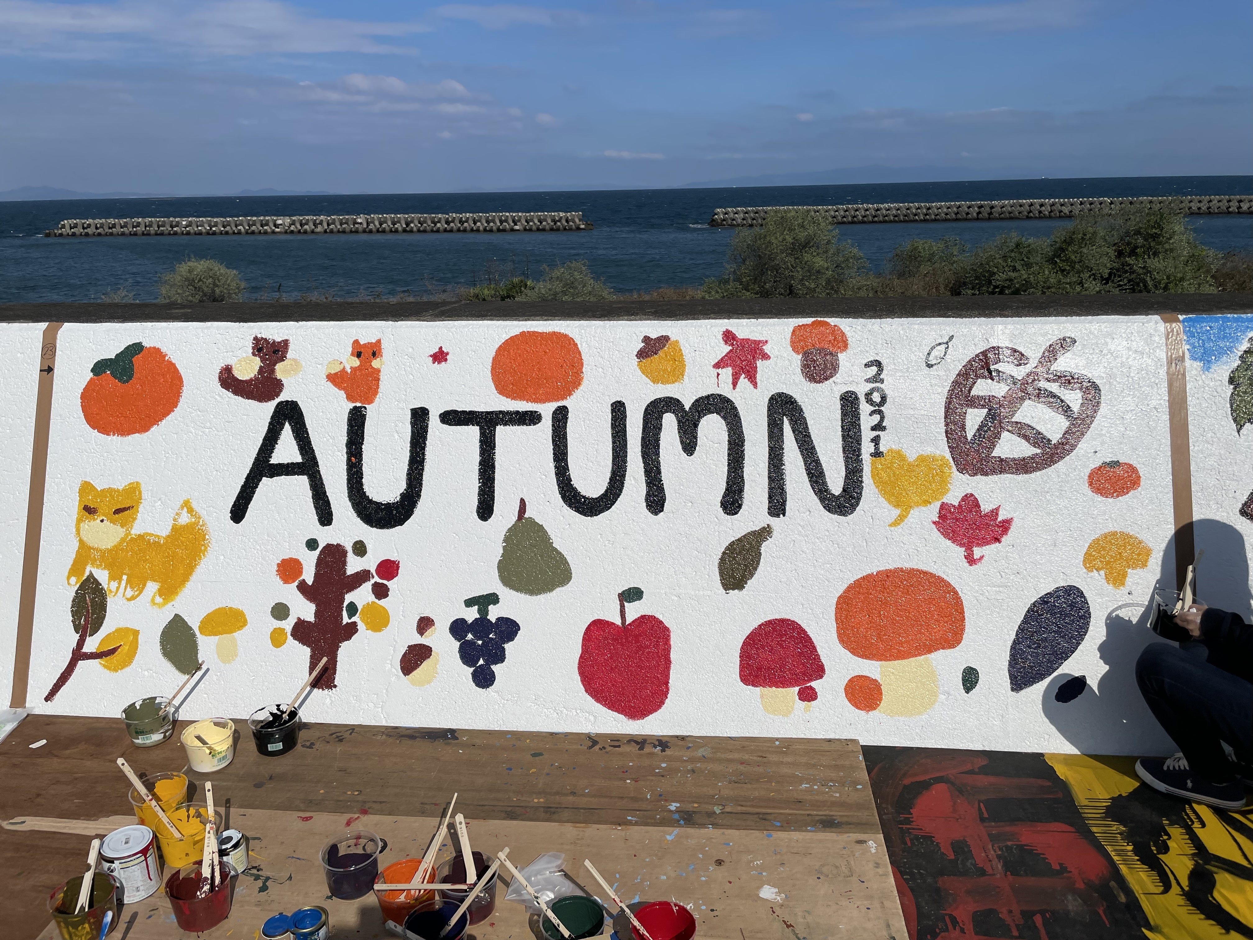 参加者は各区画購入数分(1区画:縦1.25m×横3.3m)にハケと水性塗料を使い、家族や友人たちとペンキで服や顔を汚しながら、楽しく和気あいあいとした雰囲気の中で壁画を描いていました。そして、ハロウィン・さんま・お月見・秋の運動会など数多くの素晴らしい壁画が出来上がりました。