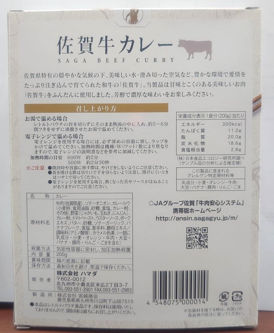 牛肉(佐賀県産)、ソテーオニオン、カレールウ(小麦粉、食用油脂、砂糖、食塩、カレー粉、その他)、野菜、(じゃがいも、玉ねぎ、にんじん)、カレー粉、トマトペースト、ウスターソース、ポークエキス、バター、砂糖、ソテーガーリック、バナナフレーク、食塩、香辛料、酵母エキス/調味料(アミノ酸等)、カラメル色素、(一部に乳成分・小麦・オレンジ・牛肉・大豆・バナナ・豚肉・りんご・ごまを含む)