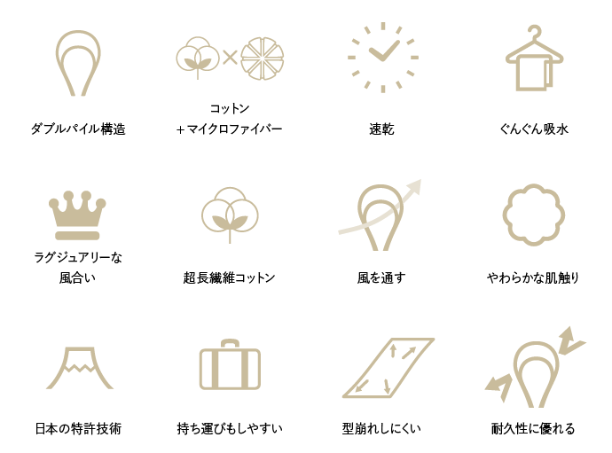 さらにダブルパイル構造により空気の通り道ができ、速乾性にも優れた、3拍子揃ったタオルが完成しました。