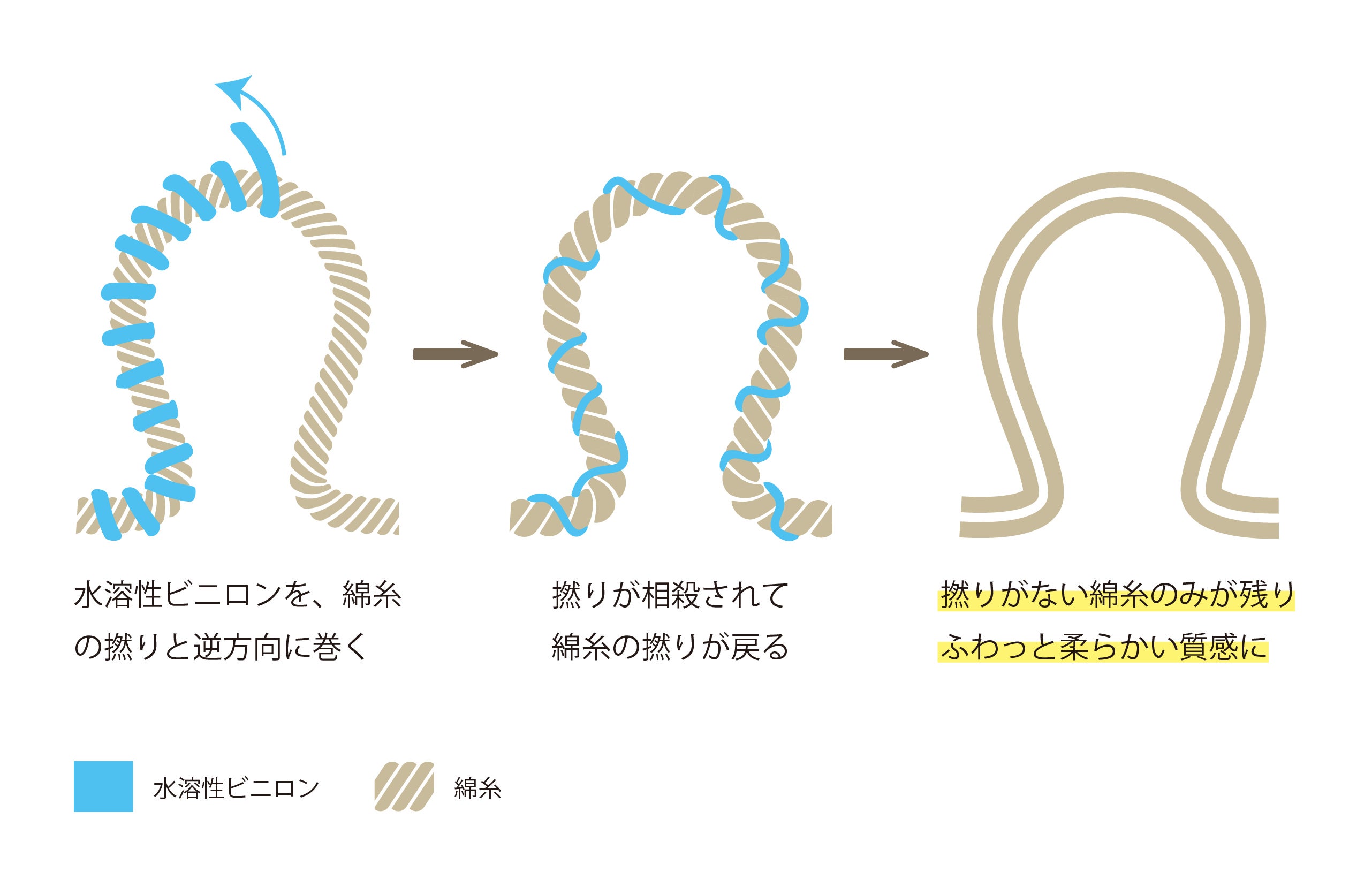 ※編みあがった後に溶解処理温度で洗うと、水溶性ビニロンは無くなり空洞が出来ます。その空洞に空気が入り込むので、膨らみがあり風合いの良いタオルとなります。