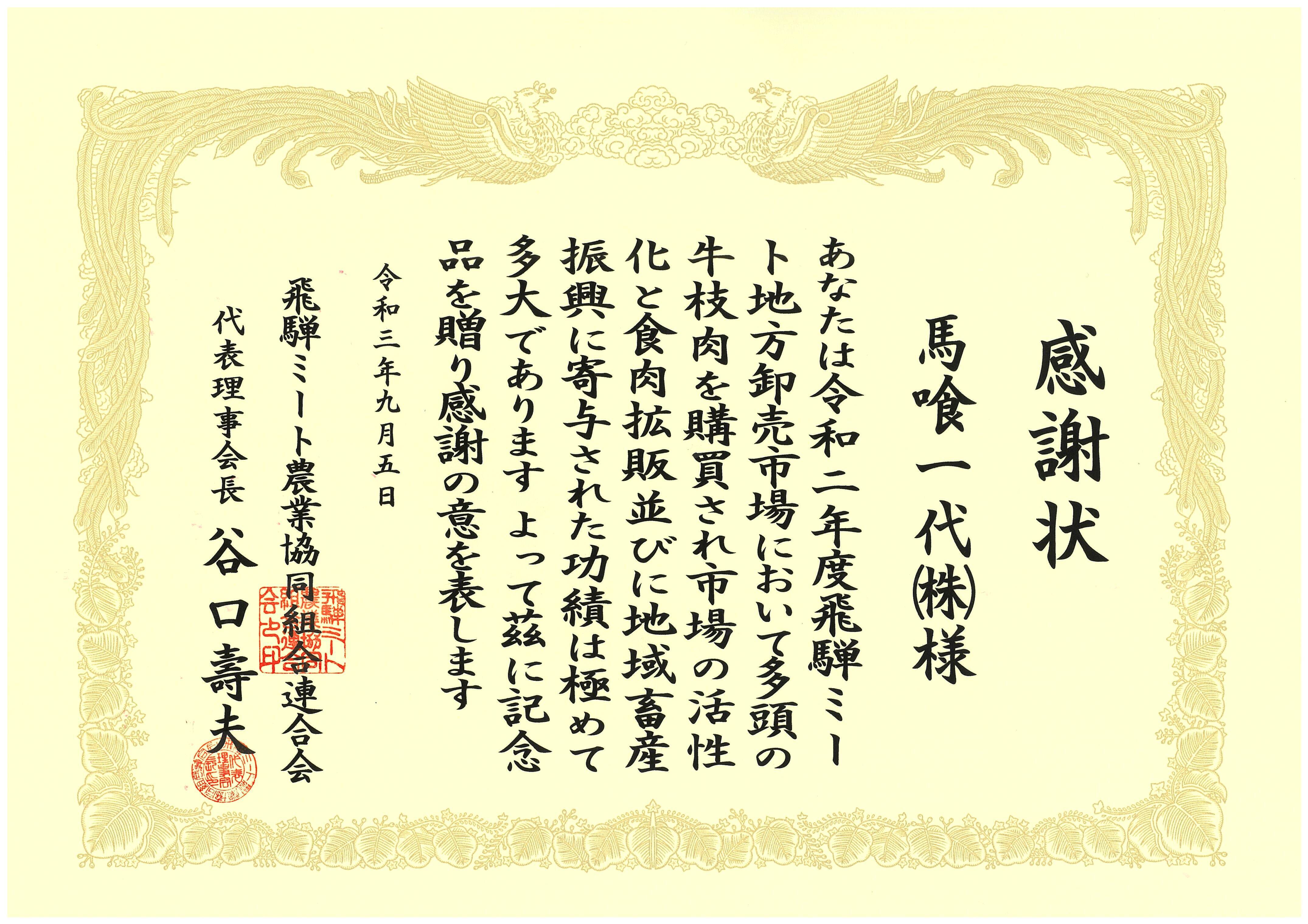 年間、牛枝肉100頭以上の購買者が牛枝肉多頭購買者として感謝状を授与されます。