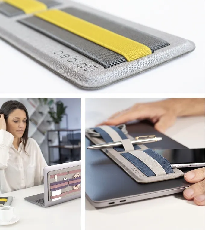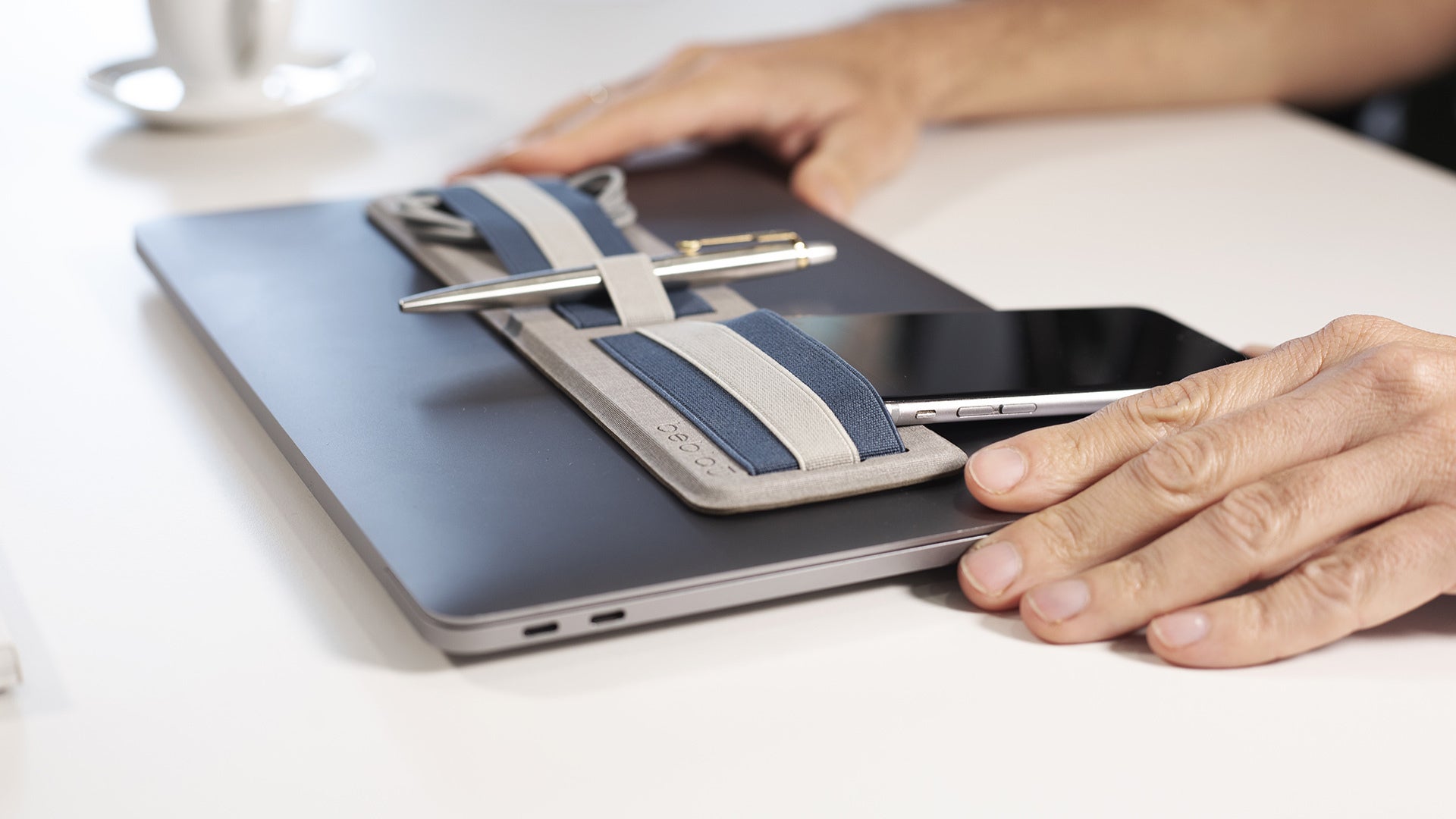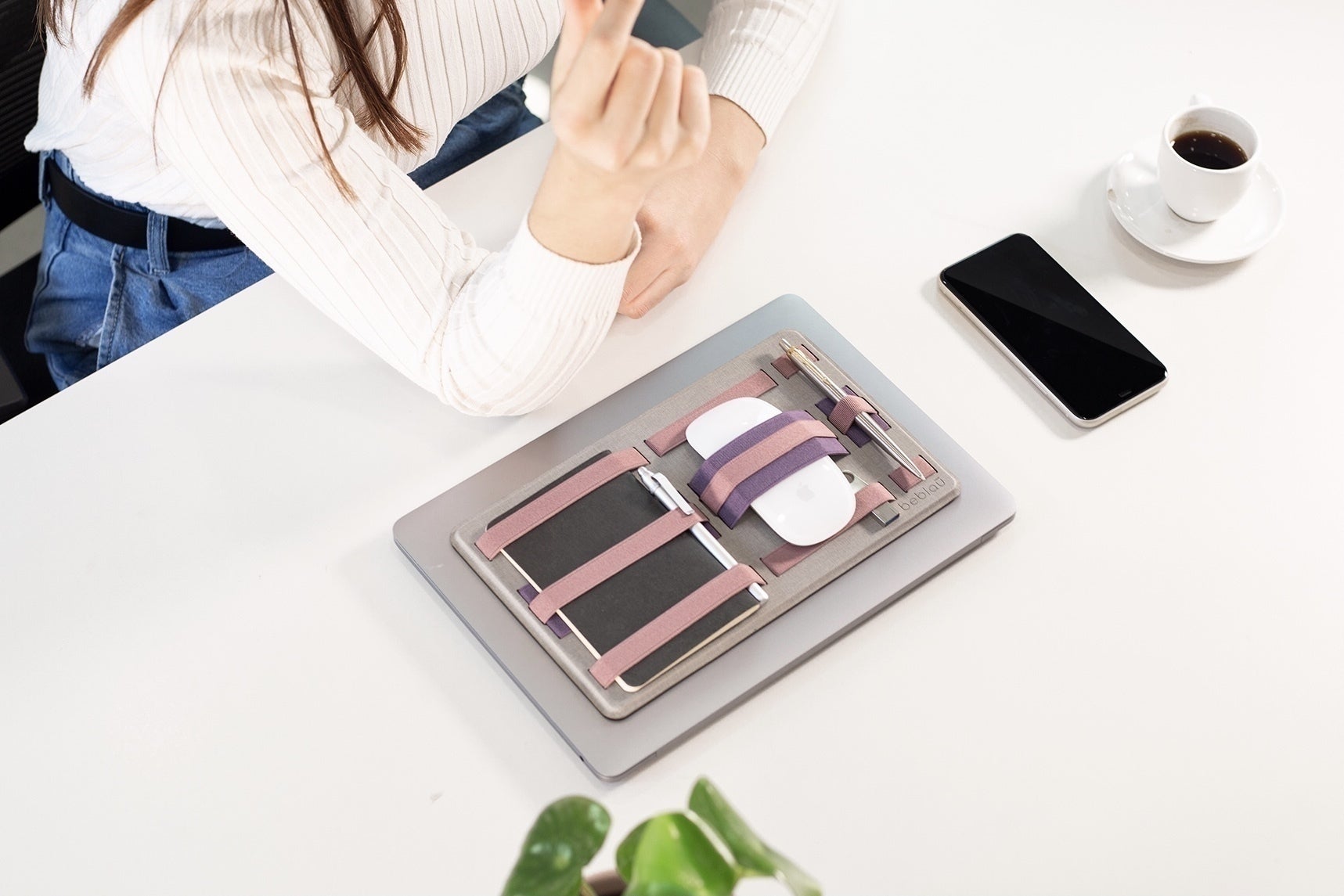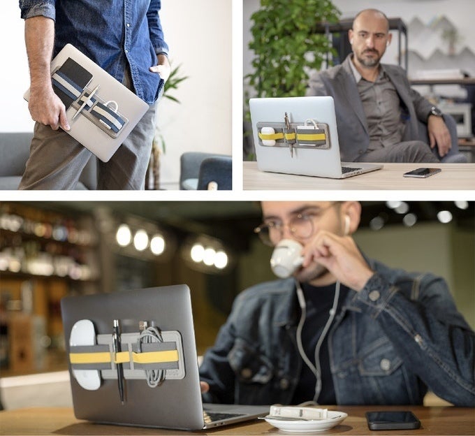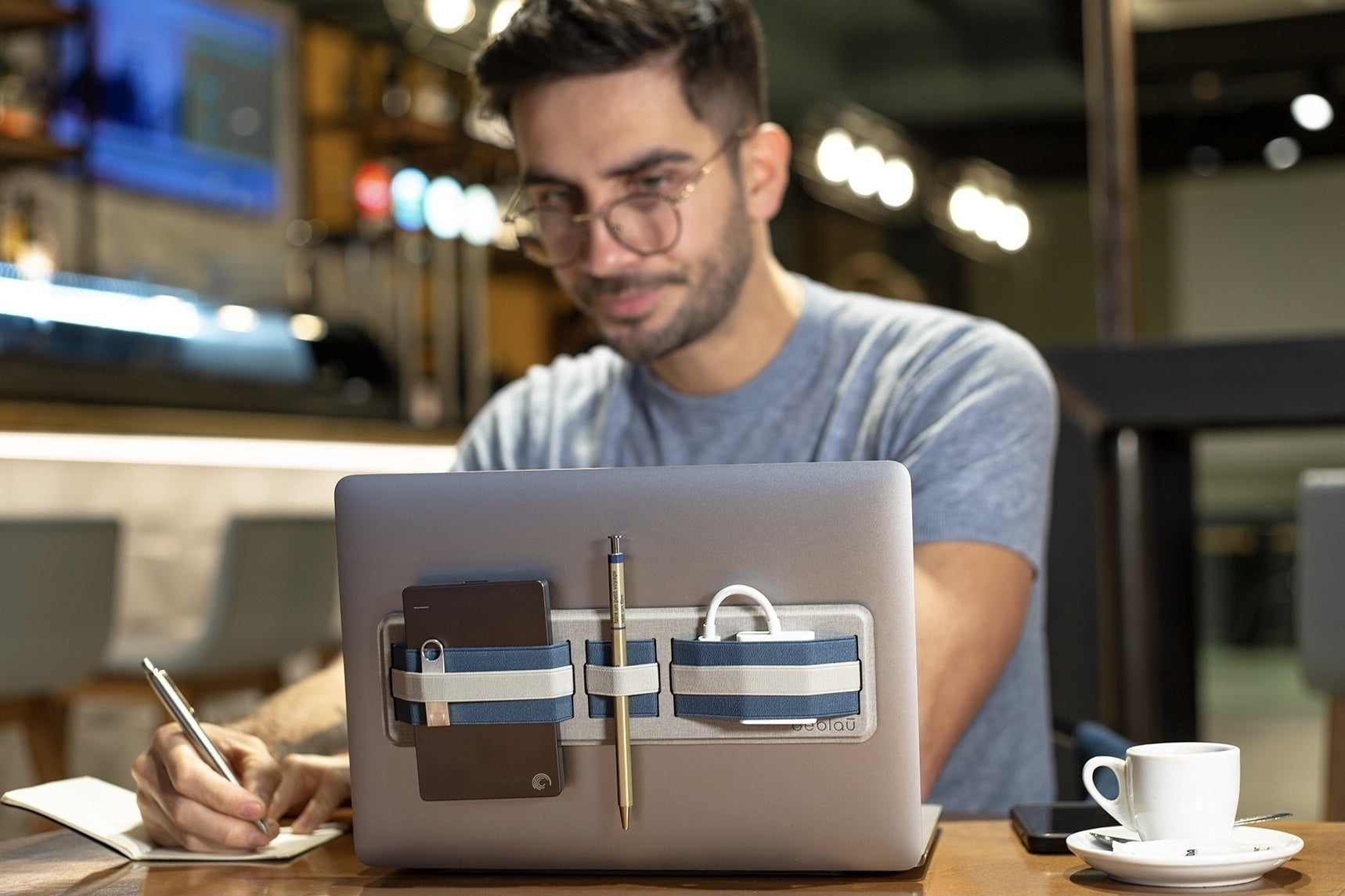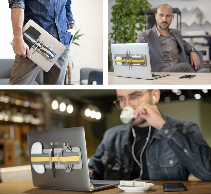スマホやモバイルバッテリー、マウスなど必要なものをひとまとめにしてラップトップに貼り付けておけば、オフィスから会議室、デスク間もシームレスな移動が可能です。