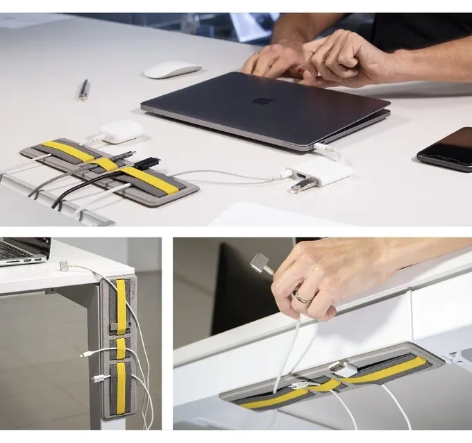 デスクの上に置いて使ったり、デスクの脚や裏面に取り付けることも可能。オフィスの仕様やデスクの配置など、作業環境によってさまざまな使い分けができます。