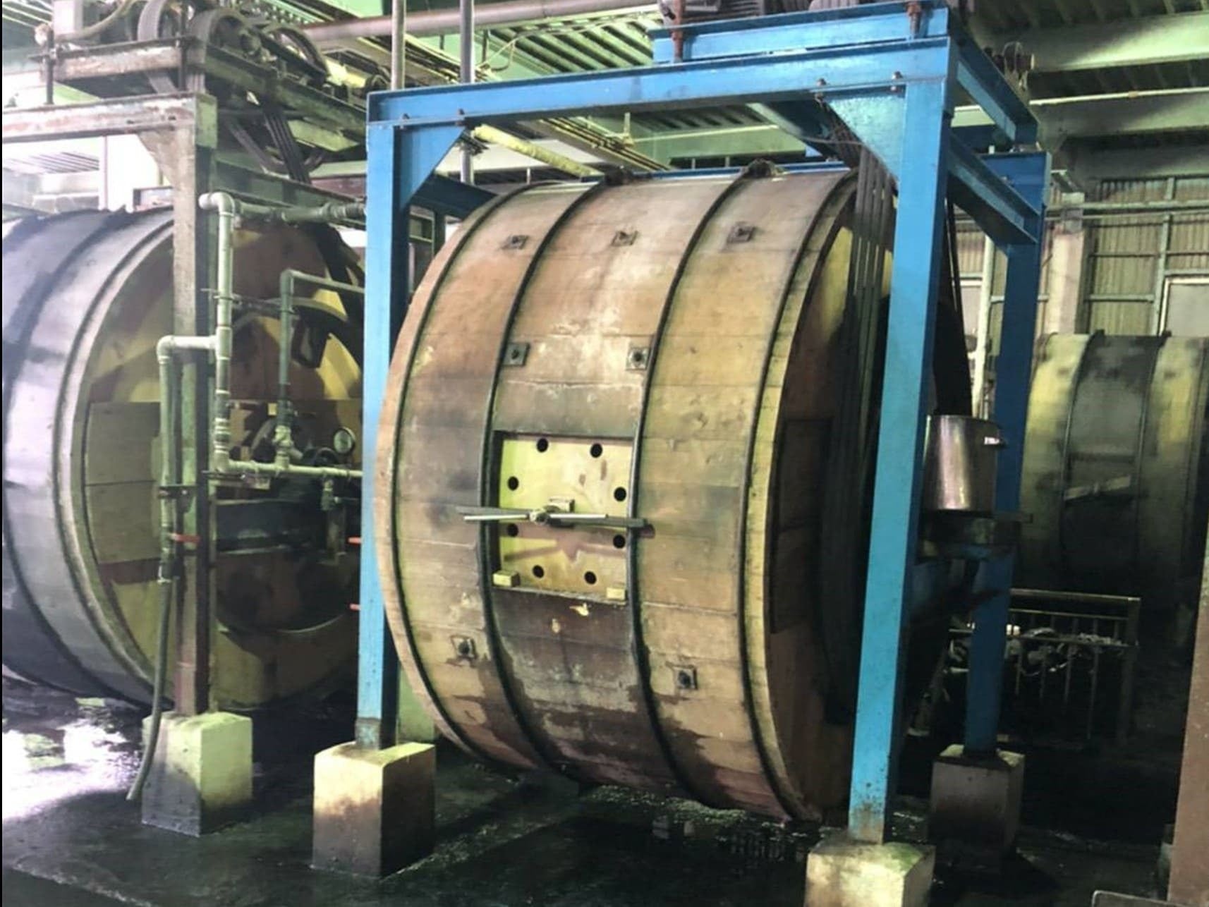 ①タイコと呼ばれる木製の大きな樽を回転させながら、中で原皮を水洗い・なめし・染色します。それぞれの工程には別のタイコを使うので、タンナー(革工場)では高さ3~4mもあるタイコが何台も並んでいる風景がみられます。