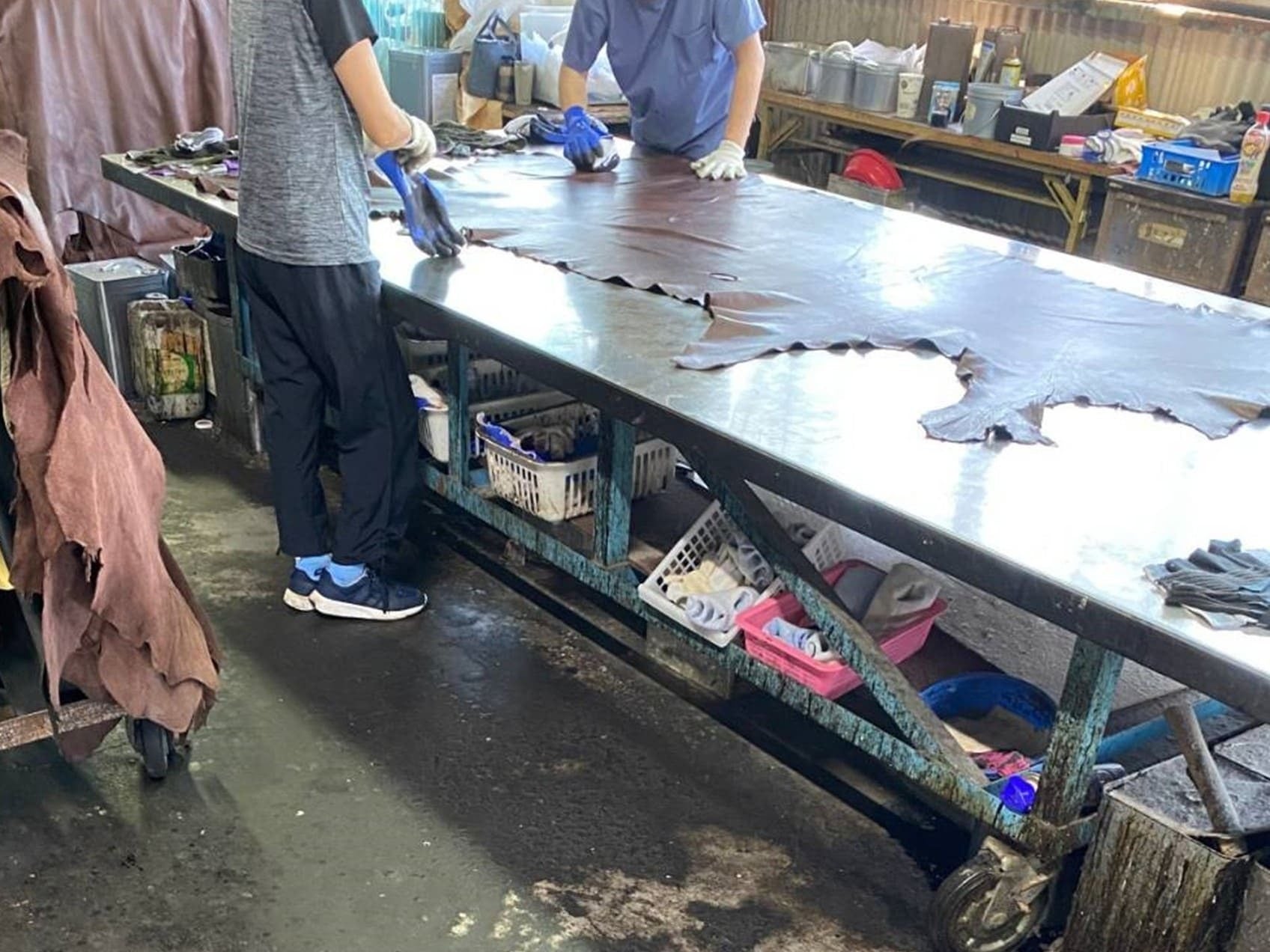 ②革製品に加工できるよう、職人の手で丁寧にシワをのばします。成牛の革は半身でも2m近くになりとても大きいので、男性でも大変力のいる作業です。