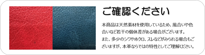 ※革の風合いを生かすために必要以上の染色や完全な色落ち加工は行っておりません。そのため水濡れや汗、摩擦などが原因で退色や色落ちすることがあります。高温多湿の時や雨の日、汗をかいた時、白や淡い色の服装をされる時には、特にご注意下さい。