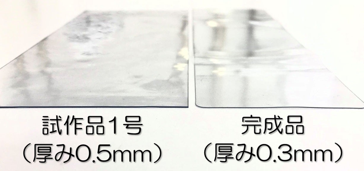 まずは厚み。素材はポリ塩化ビニルを使用していますが、厚すぎるとスマホ本体がカバーにはまらないし、薄すぎても耐久性に欠けてしまう。様々な厚みを試した結果、現在の0.3mmがどんなスマホやカバーにもはまりやすく、負荷がかかっても破れにくい厚みであるということが分かりました。