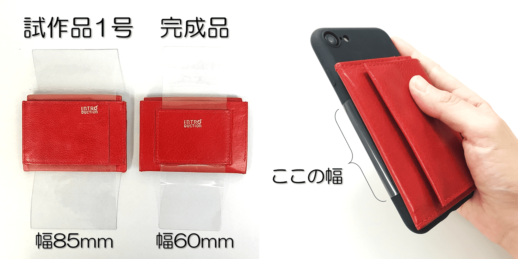 そして特に絶妙な設定なのが、60mmという縦幅の長さ。財布本体はもちろんスマホの幅に合わせて設計されていますが、カバーに巻き付ける際、ラバーホールドの幅が短すぎると財布とスマホ本体の接着面積が小さくなり、一体感が弱くなります。かといって幅を大きくしても、スマホによってはサイドに音量調節や電源ボタンがあるため、その部分に被ってしまうと操作性が落ちてしまう。様々なスマホで検証した結果、現在の長さが最も汎用性が高く、程よい摩擦が生まれるのでホールド感も増し、使いやすいサイズ感であるということになりました。