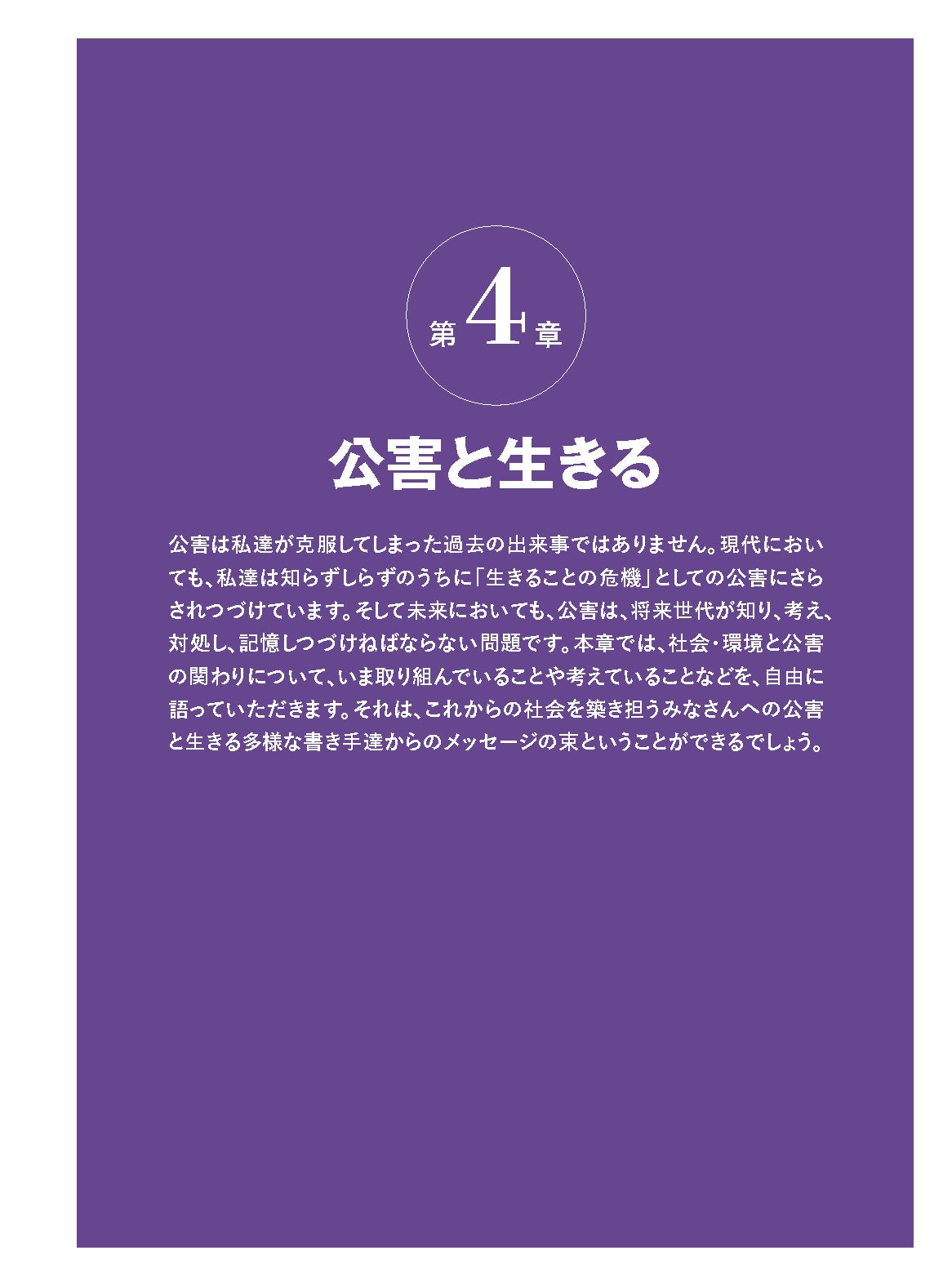公害は私達が克服してしまった過去の出来事ではありません。現代においても、私達は知らずしらずのうちに「生きることの危機」としての公害にさらされ続けています。そして未来においても、公害は、将来世代が知り、考え、対処し、記憶し続けねばならない問題です。本章では、社会・環境と公害の関わりについて、いま取り組んでいることや考えていることなどを、自由に語っていただきます。それは、これからの社会を築き担うみなさんへの公害と生きる多様な書き手達からのメッセージの束ということができるでしょう。