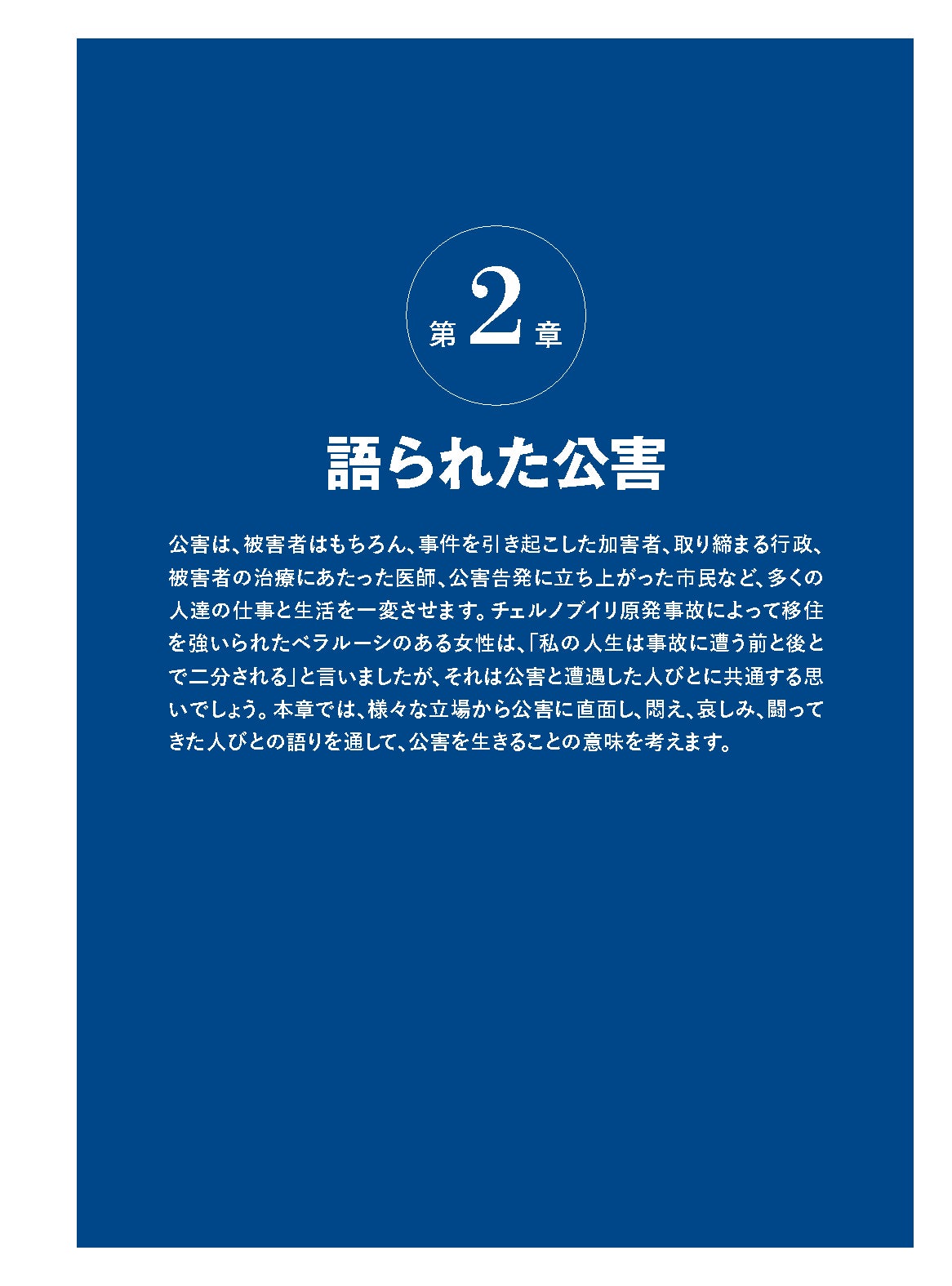 公害は、被害者はもちろん、事件を引き起こした加害者、取り締まる行政、被害者の治療にあたった医師、公害告発に立ち上がった市民など、多くの人達の仕事と生活を一変させます。 チェルノブイリ原発事故によって移住を強いられたベラルーシのある女性は、「私の人生は事故に遭う前と後とで二分される」と言いましたが、それは公害と遭遇した人びとに共通する思いでしょう。 本章では、様々な立場から公害に直面し、悶え、哀しみ、闘ってこられた方々の語りを通して公害を生きることの意味を考えます。