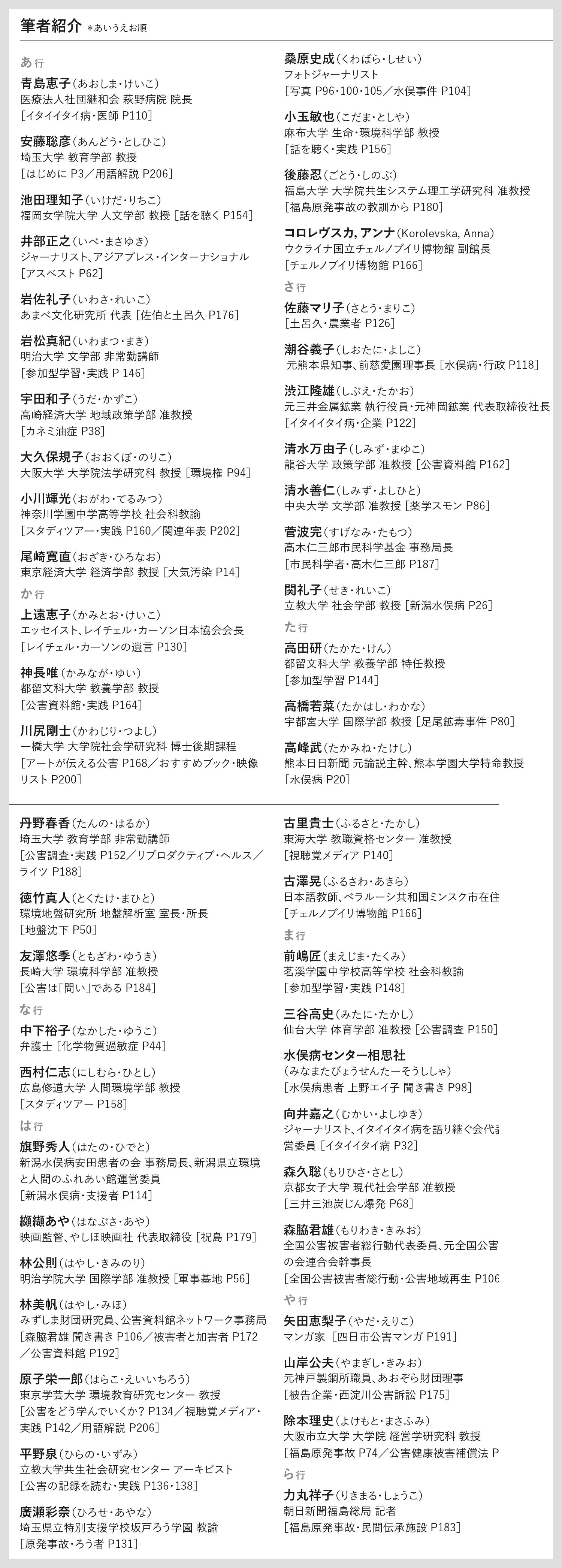 私たちの願いに応え、患者、家族、支援者、医師、企業関係者、政治家、研究者など、50名を超える方々が快く執筆を引き受けてくださいました。そのなかには、「熟慮の末、お引き受けする義務があると感じました」としてペンを取ることを決意してくださった方もおられます。この結果、「〈公害と出会い、向き合うための本〉が必要だ」と考えた50人が「いまこそ伝えたい」と思ったことを書き切った書籍を刊行する道が開けました。