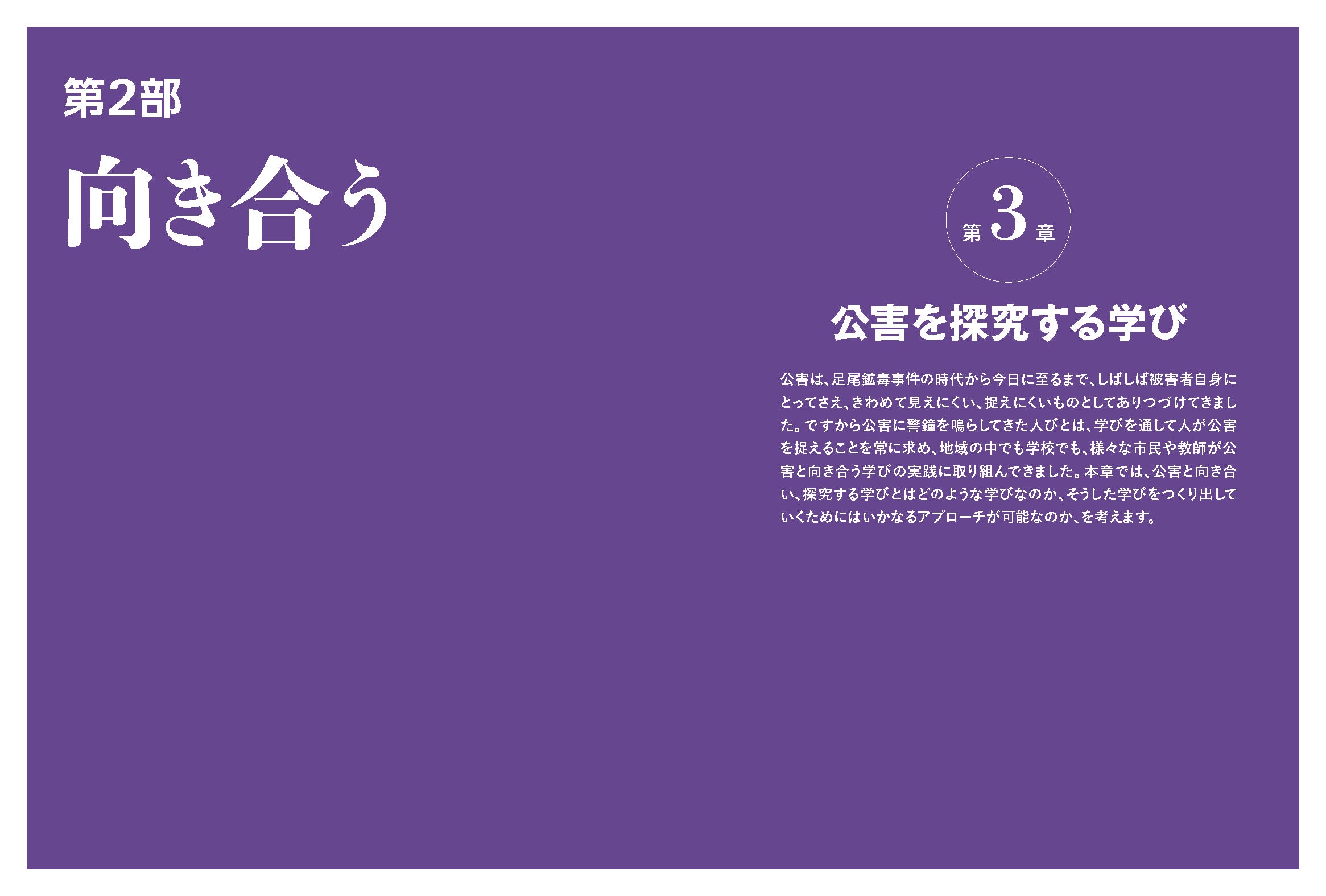 また、患者、家族、医師、企業関係者など、多様な立場からの経験についても原稿を寄せていただきました。さらに、公害を探究する学びを実践するための基本的な考え方や具体的な方法、さらにこれからの社会に向けてどのように公害と向き合っていくかについての多様な立場からのメッセージも収録することにしています。