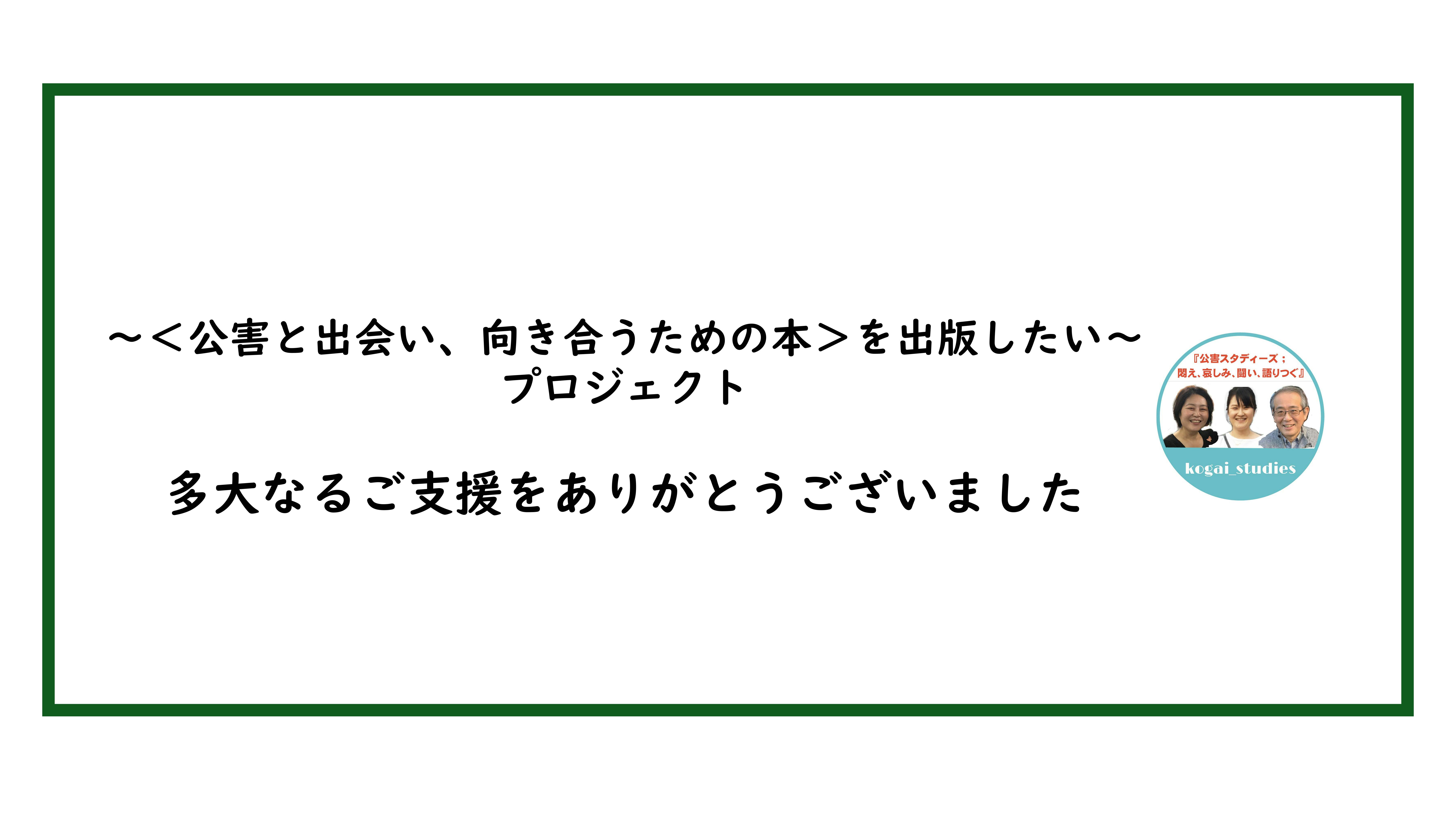 このたびは、『公害スタディーズ;悶え、哀しみ、闘い、語りつぐ』を刊行するためのクラウドファンディングプロジェクトにご協力いただきまして、まことにありがとうございました。