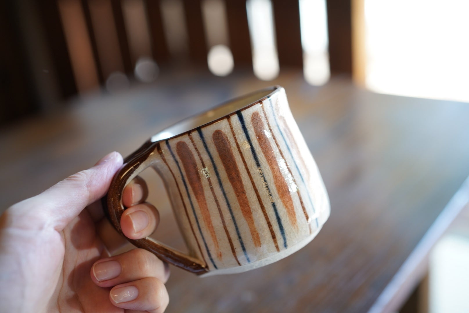 「コーヒーカップは、現代のものです。瀬戸本業窯の伝統はない。民藝運動の関わりのなかで、バーナードリーチが訪れ、もたらされました。6代目・水野半次郎が、“リーチハンドル”と呼ばれる、イギリスのピッチャー(水差し)のハンドルをつける技法を直接教わり、現在も、その歴史をおもんじて作っています」