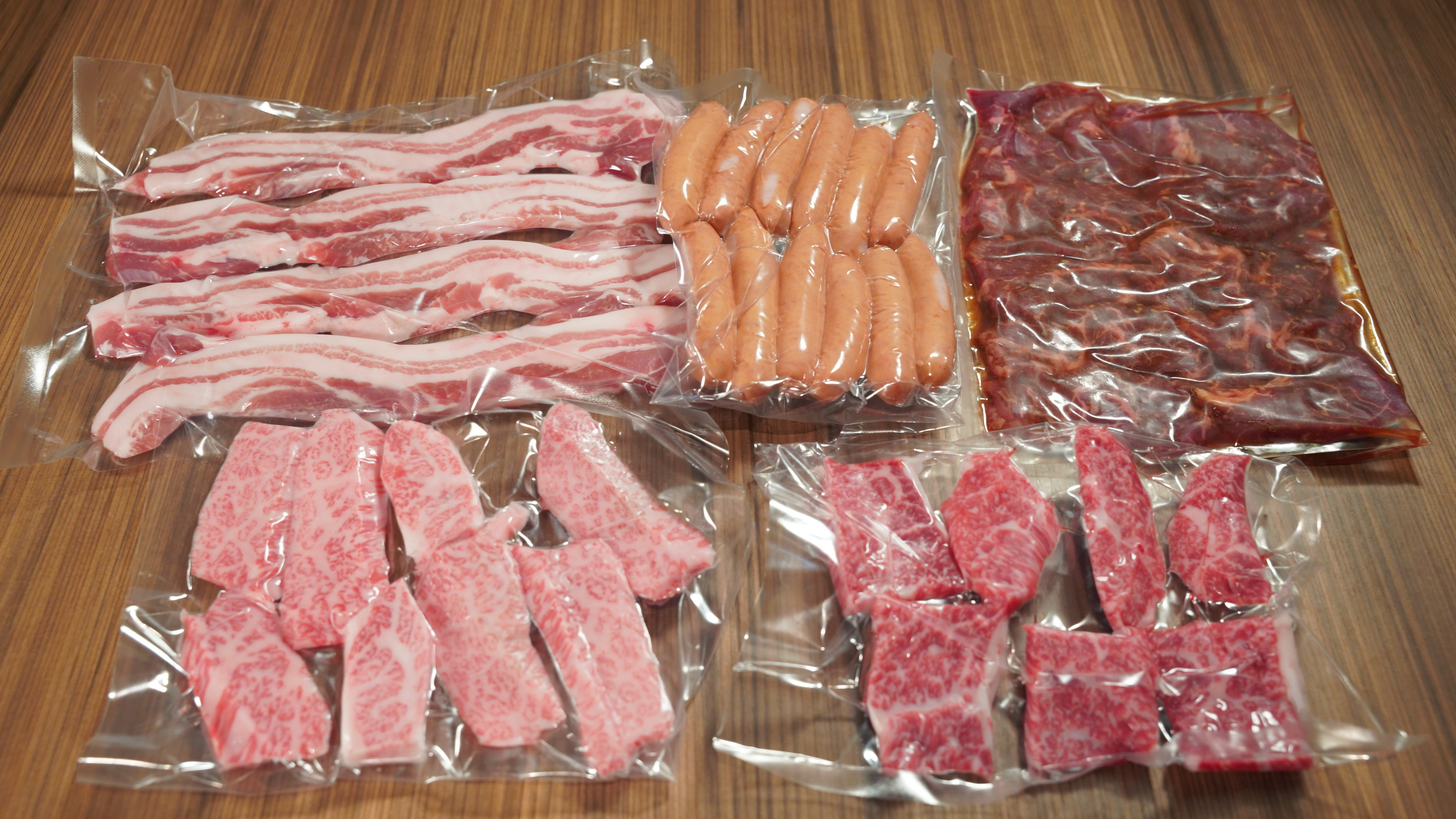 ①黒毛和牛特上ロース 300g、②黒毛和牛上ロース 300g、③ハラミ(米国産) 600g、④豚カルビ(オランダ産) 900g、⑤ソーセージ 900g、⑥自家製タレ(100ml)、⑦おうち焼肉マニュアル