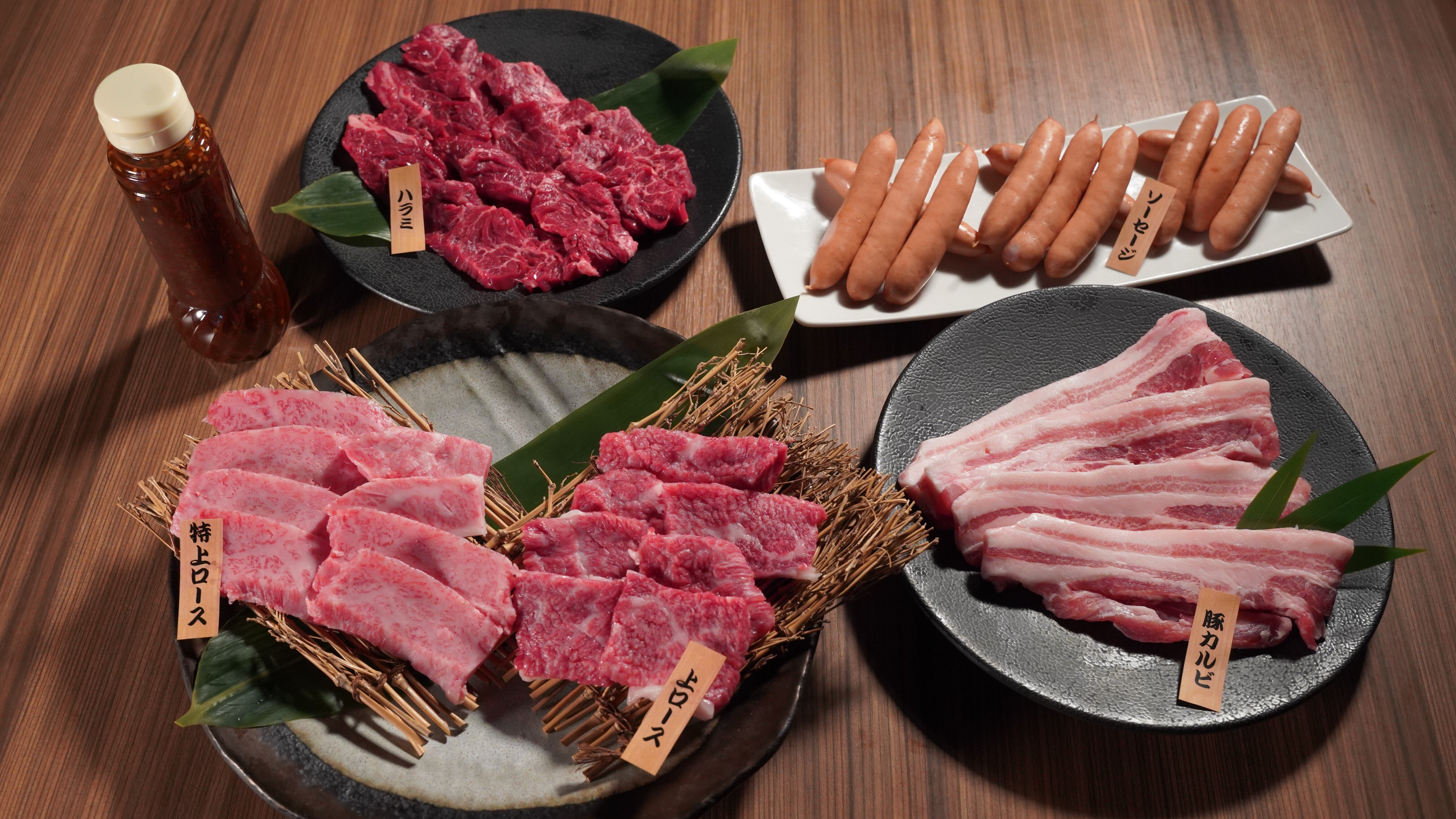 ①黒毛和牛特上ロース 200g、②黒毛和牛上ロース 200g、③ハラミ(米国産) 400g、④豚カルビ(オランダ産) 600g、⑤ソーセージ 600g、⑥自家製タレ(100ml)、⑦おうち焼肉マニュアル