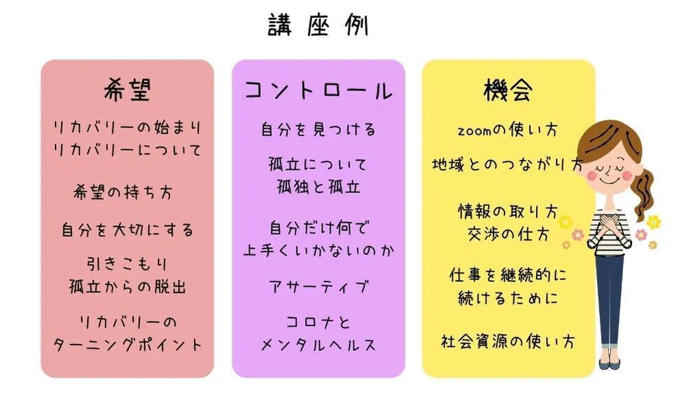 法令に基づく医療、診察行為を行うものではありません。教育的アプローチであり、治療を目的としたものでもありません。精神保健福祉領域の専門職による専門的知識と精神的つらさを経験しリカバリーしてきた人々との経験知を活用した講座を開講します。