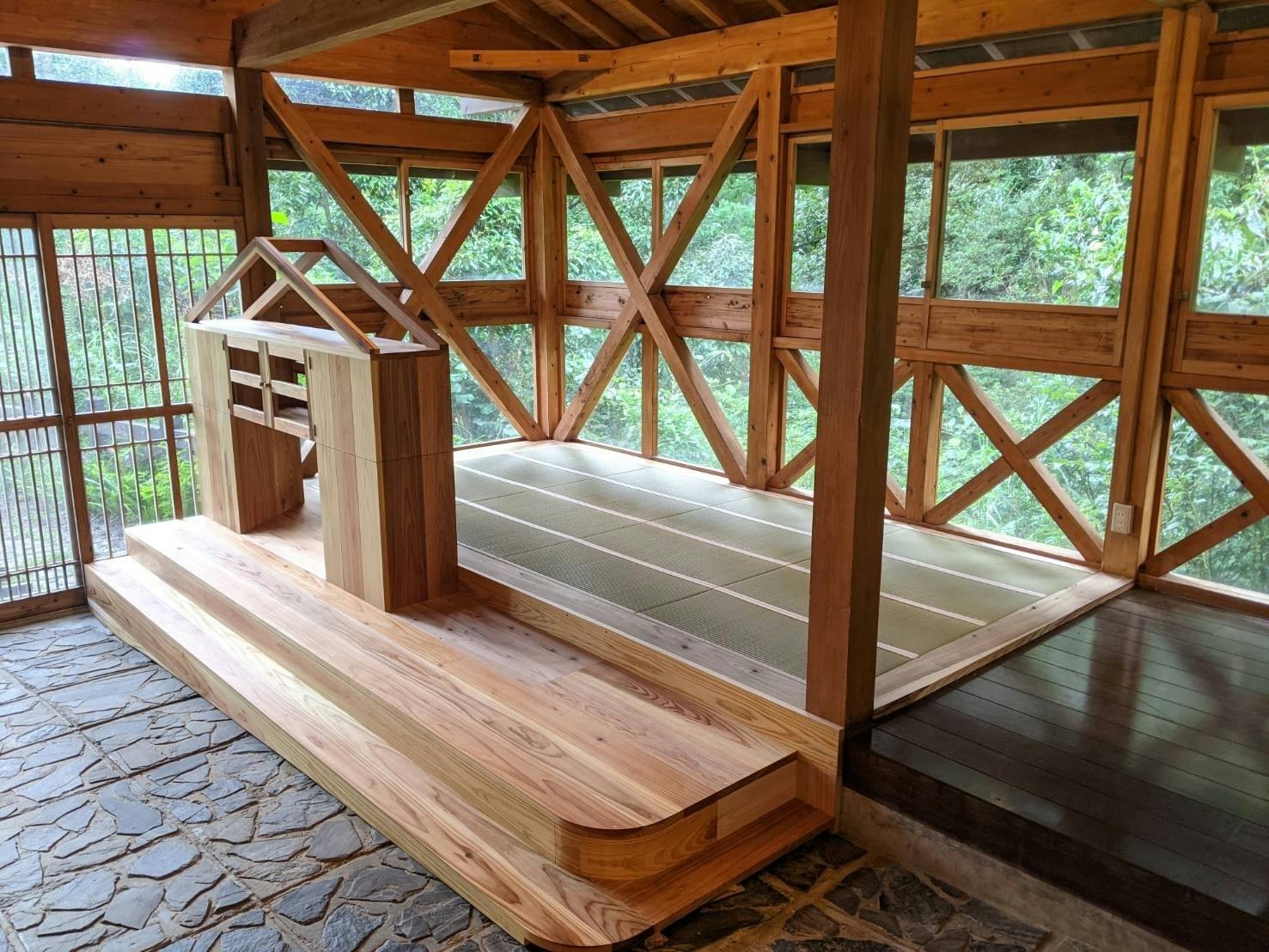 一昨日、そのキッズハウスの内側に、これまた美しく、心地の良い畳が入りました。畳の縁(へり)は屋久島の地杉で染めた、屋久島にしかないオリジナルのもの。熊本産のい草は、伝統的かつ特殊な工法で作られており、屋久島の湿気にも強い素材なんだそうです。