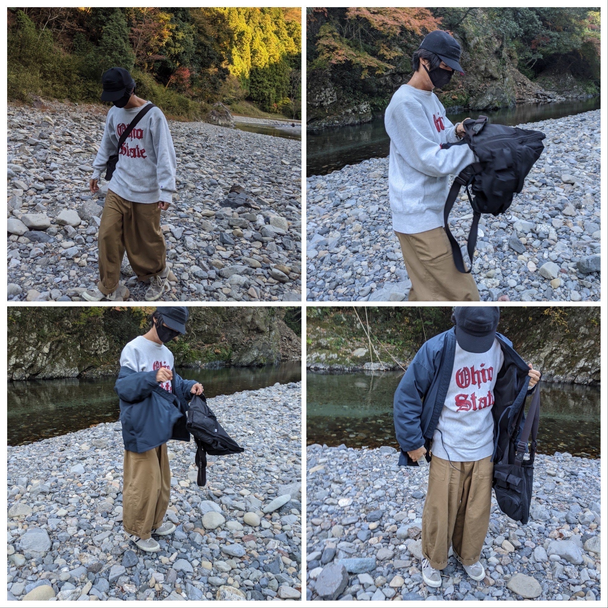 紅葉狩りと川辺散策をしたのですが、寒暖差があるのでバッグ状態にしてアウターを仕込んでおきました!