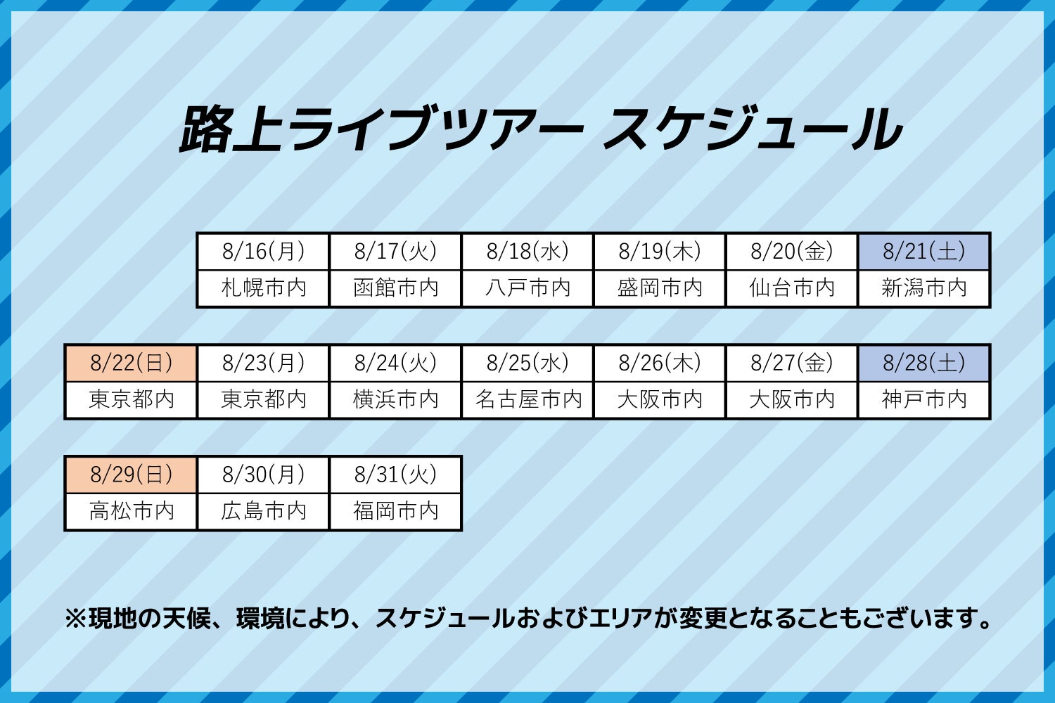 2021/08/16(月) ~ 2021/08/31(火) 全国主要都市を含む全14ヵ所にて路上ライブツアー