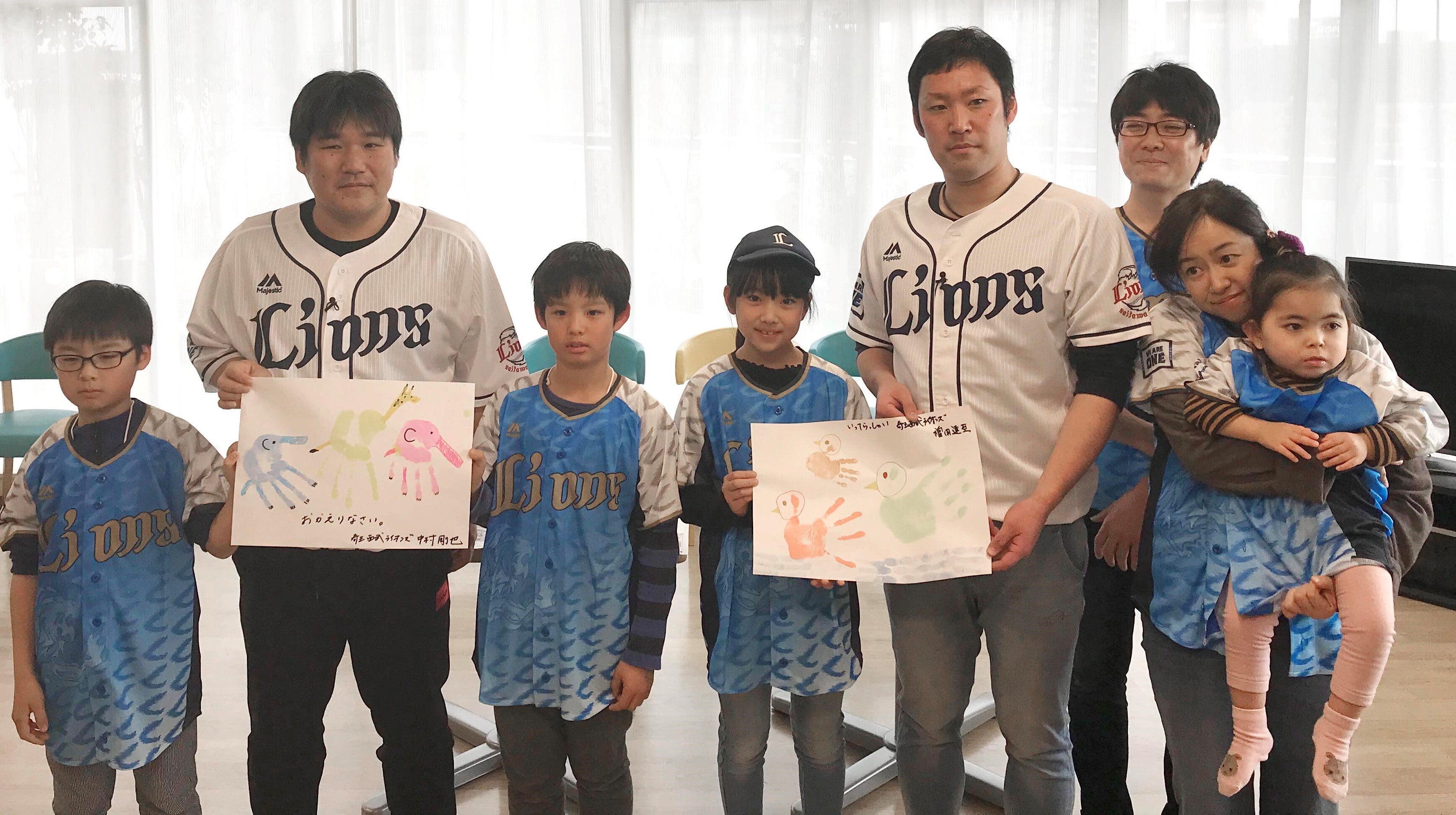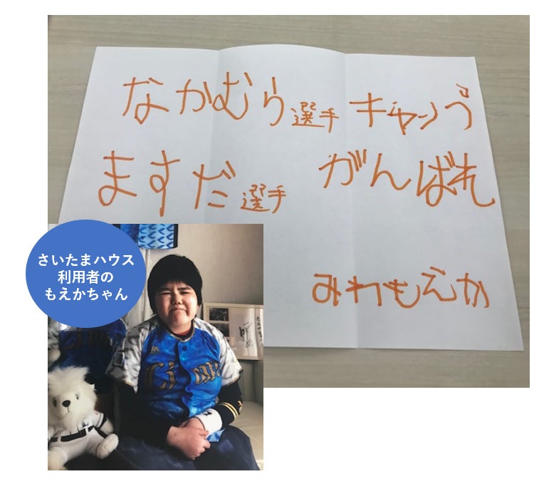 2020年の1月には、さいたまハウスに埼玉西武ライオンズの中村選手、増田投手が訪問され、ご利用されたご家族と交流をしてくださいました。一緒に「手のひらアート」を楽しんだり、プレゼントされたユニフォームを、うれしそうにお子さんたちは着ていました。参加されたお子さんとご家族は、継続的に病院で治療を受けている方でしたので、選手との交流に大変感激され励まされました。