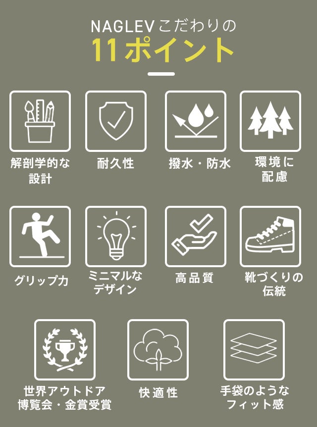 “NAGLEV”は粗悪品が多く出回るようになったアウトドアフットウェア市場に一石を投じたいという思いから、ハイキングシューズで培われた丈夫さに、トレイルランニングシューズの敏捷性を融合させた【UNICO】を製作。
