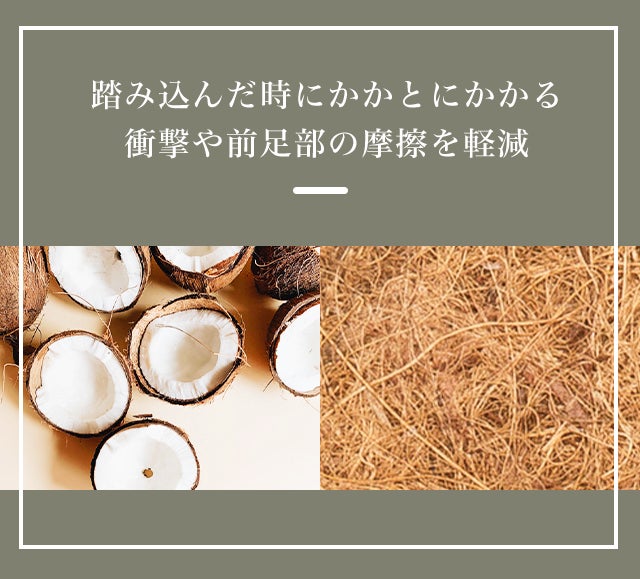 インソールにはベジタブルタンニン鞣しの天然皮革にココナッツ繊維を組み合わせ、踏み込んだ時にかかとにかかる衝撃や前足部の摩擦を軽減。