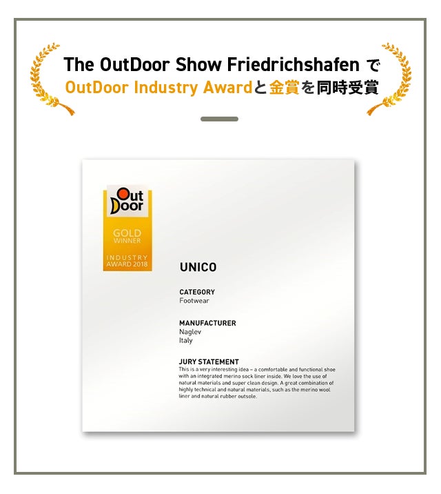 【UNICO】はドイツのフリードリヒスハーフェンで毎年7月に開かれる欧州最大規模の世界アウトドア博覧会“The OutDoor Show Friedrichshafen”でOutDoor Industry Awardと金賞を同時受賞。