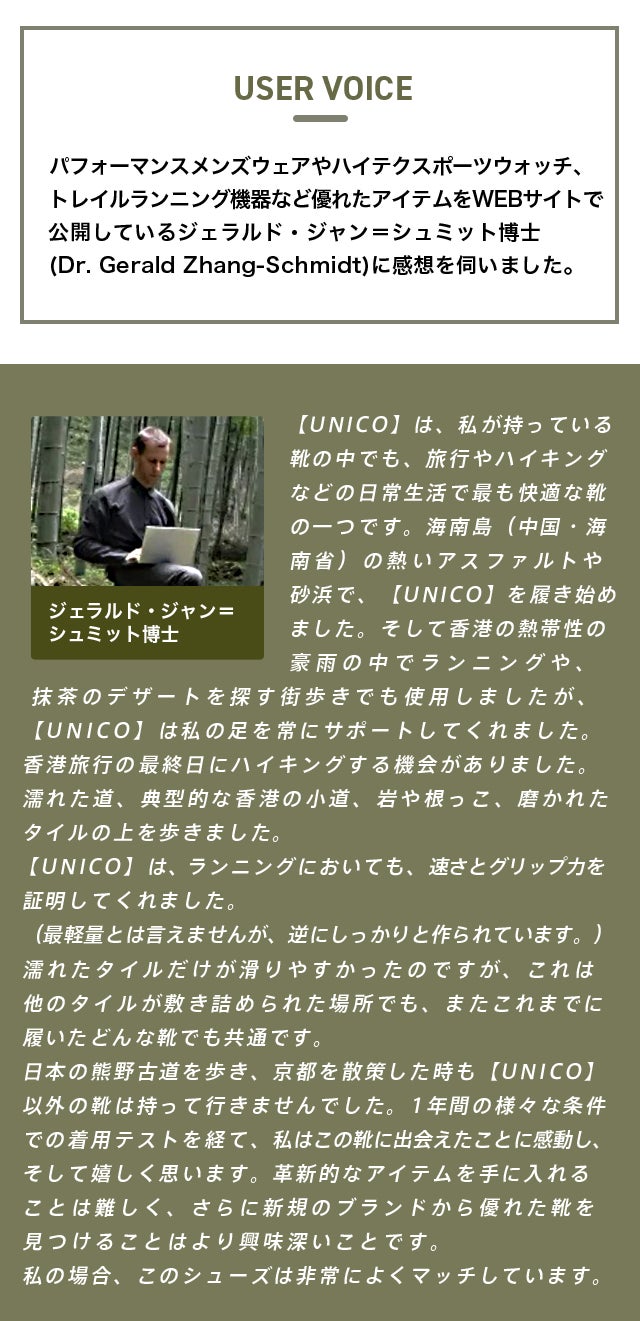 'UNICO 'と' UNICO WP COMBAT'は、アウトドア・マルチスポーツ用のフットウェアです。私たちは環境にやさしい天然素材を高度な技術で捉えたアウトドアフットウェアを作っています。開発段階では、自然の要素と技術的に壊れにくい素材を組み合わせた2.0サスティナブル製品の制作に焦点を当てました。