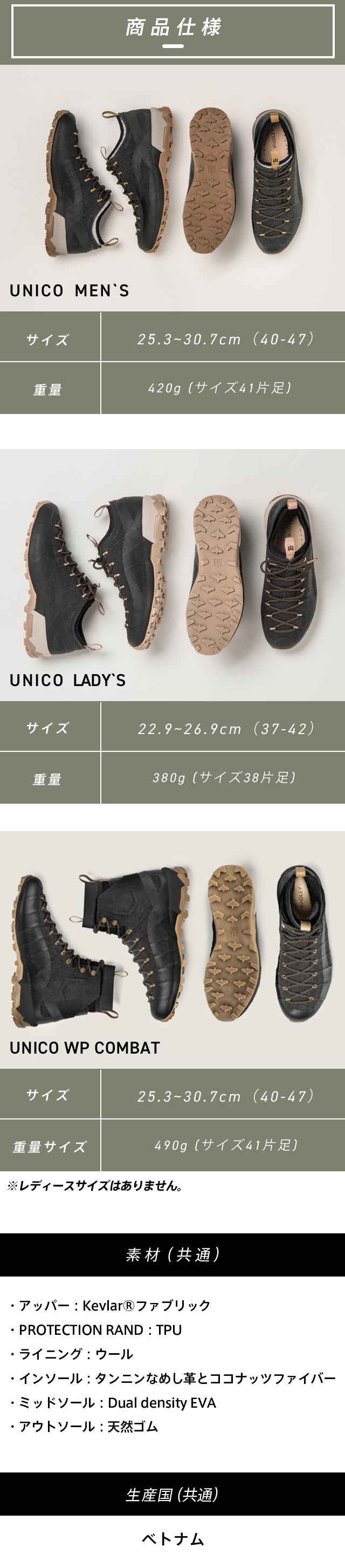 ※防水・透湿性生地を使用しているのは、 UNICO WP COMBAT(ハイカットモデル)になります。