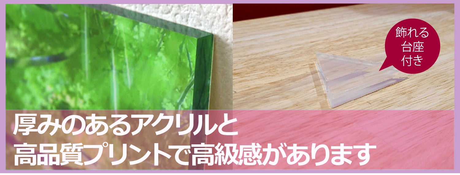 画像の様に厚みのあるアクリル板に、全12色の超高性能プリンターで印刷した高品質なイラストを接着しています。アクリルに直接印刷した従来のUV印刷とはくらべ物にならない程の圧倒的な画質を誇ります。アクリルアートをそのまま飾るための台座も付いてきます。