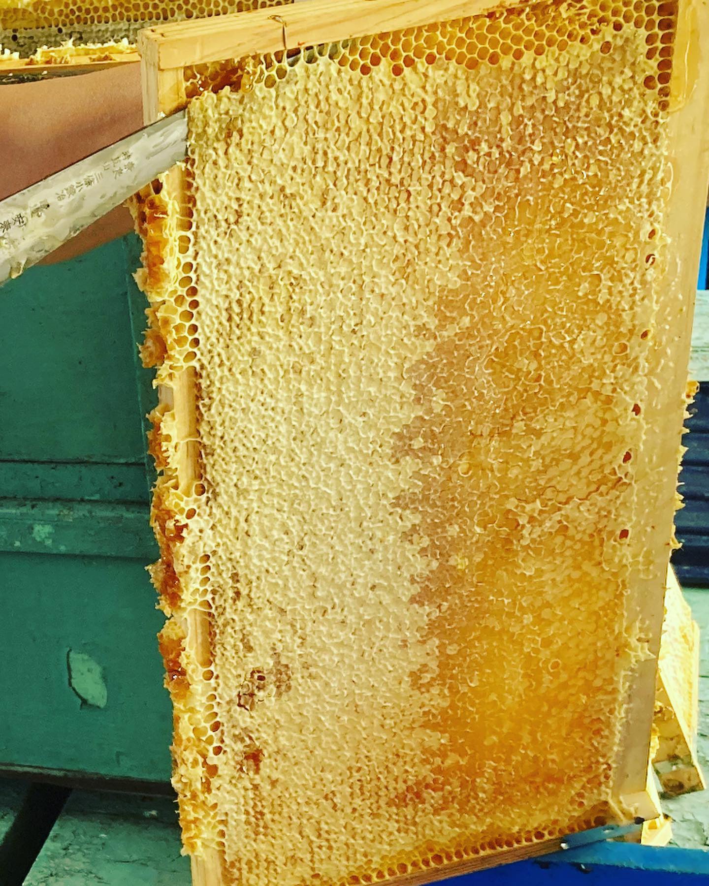 蜂蜜の巣板から蜜をナイフでとる作業です。本来はキレイに滑らかな断面になるはずが、不器用なため、荒々しい断面となりました。残念クラフトリカーに使用している蜂蜜は菩提樹ですが、今回の作業は蕎麦の蜂蜜です。