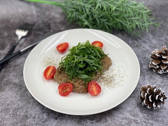 紫蘇香るこねないハンバーグ【材料】牛豚合挽肉…250g紫蘇の葉…5 枚塩・胡椒…お好みで付け合わせの野菜…お好みで【作り方】① アルミホイルの上に、牛豚合挽肉のパックをひっくり返して載せる。② 上からラップを載せ、端の方を整える。③ 多めに塩コショウをふる。④ 200 度のオーブントースターで 15 分焼く。⑤ 焼いている間に紫蘇をみじん切りにする。⑥ 焼きあがったら皿に盛り付け、⑤を載せて出来上がり。