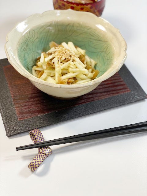 リンゴと搾菜の和え物【材料】りんご…1/4個(約 50g)搾菜…50g白ごま…適量ラー油…お好みで【作り方】① リンゴと搾菜を千切りにする。② ①にラー油を加えて軽く和える。③ 20 分程冷蔵庫で味をなじませる。④ 白ごまを振って出来あがり。【with EZOUSAGI】搾菜とラー油で中華風の和え物にしました。リンゴのさわやかな味わいと食感がポイント。甘みのある蜂蜜ベースのお湯割りと相性が◎