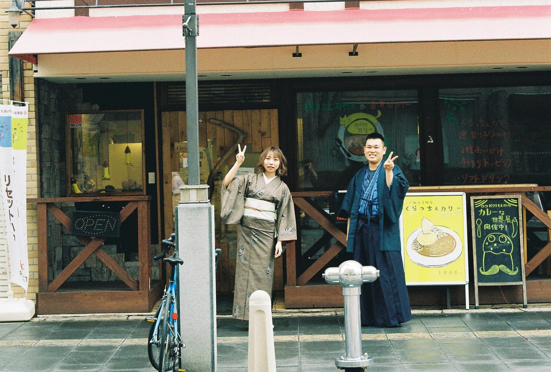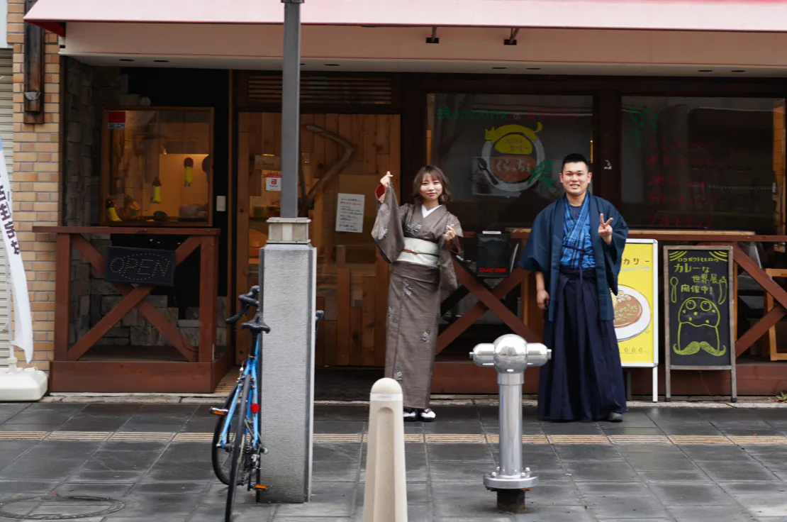 - くらっちぇ店主の『モデルが着物着て、商店街を練り歩いて、その様子をレトロカメラで写真撮ったらエモい』というとっさの思い付きから、モデルに出演依頼をするところから始まり、商店街、着付け屋さんを巻き込んだ写真撮影会を実施しました。