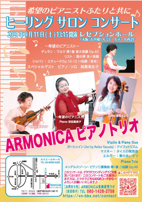 2022/08/01 13:53暑中お見舞い申し上げます。毎日、異常な暑さの中、皆さま、お元気に過ごされていますか?ARMONICAピアノトリオのコンサートのご案内をさせていただきます。タイトル:さわやかクラシカルコンサート日 時 :2022年9月18日(日)14:00開演(13:45開場)場 所 :守口市立文化センターB1リハーサル室 (京阪守口市駅下車、東口より徒歩2分、京阪百貨店南側)昨年は、ピアニストの安田恵美子が、コンサート直前にコロナ重篤肺炎で入院しましたが、奇跡的に回復し、3週間で退院することができました。その後、昨年末12月18日には、リアルのコンサートで、回復のご報告ができました。コロナで、重篤、重篤に近い状態で入院された方がおられましたら、まだまだその後遺症に悩まされたり、ということもあると思います。妹、安田恵美子の場合も、退院日に私が病院へ迎えに行った時には、体中の筋力が落ちまくっていたため、タクシーに乗せるのも一苦労でした。昨年末のコンサートでは、なんとか演奏はできましたが、練習する持続力がほとんど無かったので大変だったようです。少しずつではありますが、昨年よりは回復が進み、コンサートに向けての練習も、1時間、2時間と持続力が持てるようになってきたようです。今回は、久しぶりに、私達、ARMONICAピアノトリオのメンバーだけでのコンサートとなります。皆さまにお越し頂けると大変嬉しいです。是非、私達の心からの響きを生演奏でお聴き頂ければと思います。場所は、京阪守口市駅より徒歩2分の文化センター内B1にあります、リハーサル室となります。*コンサート会場では、安心・安全のためイオンフレッシュ(医療用物質生成器)を最強で稼働します。入場料 :当日 2,600円 ◆事前予約(事前振込)◆ Solo(1名) 2,500円 ペア(2名) 4,600円(おひとり2,300円) トリオ(3名) 6,300円(おひとり2,100円) 事前予約のお申込みはこちらのQRコードを読み込んでください。もしくは、こちらのリンクをクリックしていただくと、申込みフォームへ飛びます。https://forms.gle/7LydwA5Q2GCU6pke6最後までお読み頂きましてありがとうございました。皆さまのご来場をお待ちしております<m(__)m> もっと見る