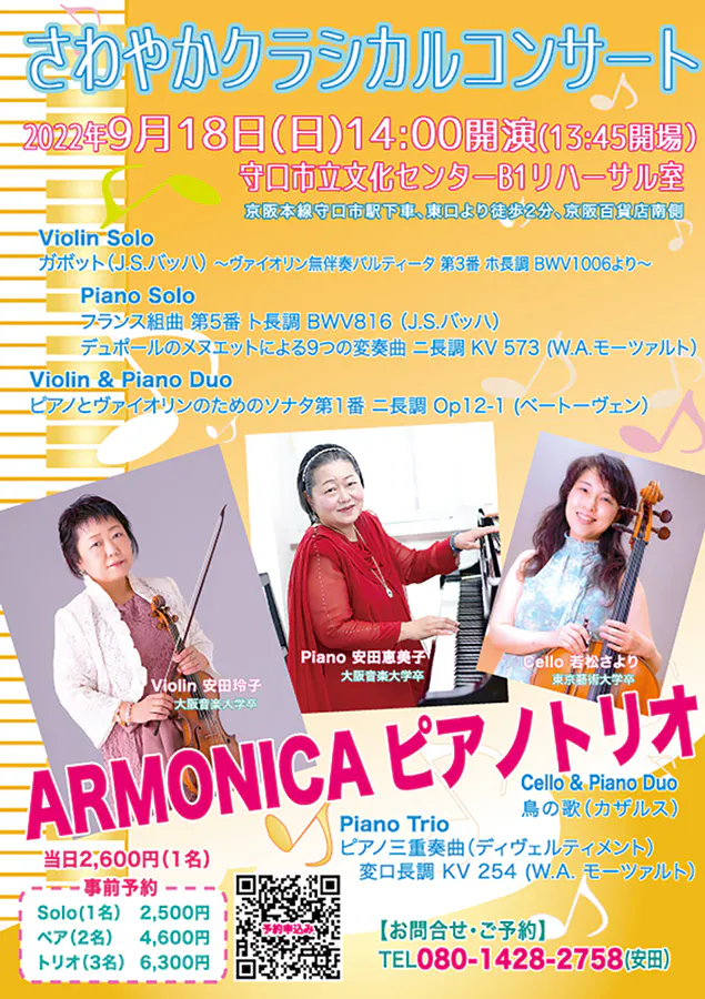 9/18『さわやかクラシカルコンサート』(守口市立文化センターB1リハーサル室)ご予約受付開始しました♪