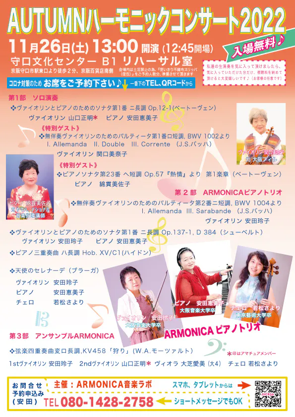 2022/11/09 13:30今年ラストになるコンサートのご案内です。『AUTUMNハーモニックコンサート2022』日時:11月26日(土) 13:00開演(12:45開場)場所:リハーサル室(守口文化センターB1) *京阪守口市駅下車、東口より徒歩2分。京阪百貨店南側。希望のピアニストのひとり、妹の安田恵美子@Pfですが、昨年9月1日に、コロナ重篤肺炎で緊急入院、幸い命が救われ、3週間で退院し、昨年末のコンサートにも、何とか出演できました。今年は、9月18日のARMONICAピアノトリオのコンサートにも出演。少しずつですが、回復してきています。今回は、今年ラストとなるコンサートに、希望のピアニストふたりが揃って出演します。今年85歳になる、もうひとりの希望のピアニスト、綿貫美佐子氏も、益々元気で活動されています。今回は、ベートーヴェンのピアノソナタ『熱情』より第1楽章を演奏されます。ヴァイオリンソロ、ヴァイオリンソナタ、ピアノトリオ、そしてラストには、Mozartのハイドンセットより『狩』(1楽章のみの予定)を演奏予定です。定員40名程度の小さいお部屋ですが、生演奏を身近に楽しんで頂きやすいと思っています。今回は、入場無料ですので、お気軽にお越し頂ければと思います。ただし、お席はあらかじめご予約をお願いしております。また、会場内は、土足禁止のため、当方で、個包されている使いきりスリッパをご用意します。(気になる方は、上履きをご準備いただければと思います。)表示のチラシの通りですが、事前の座席予約は、私宛てに 080-1428-2758 へお電話、またはSMSでご連絡を頂くか、表示のQRコードを読み込んでメールフォームへのご入力をお願いいたします。 もっと見る